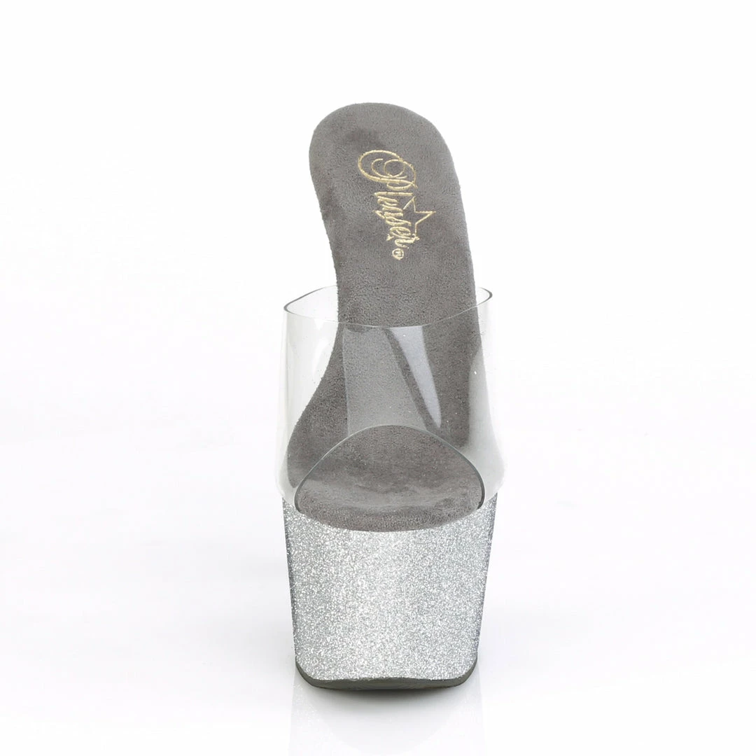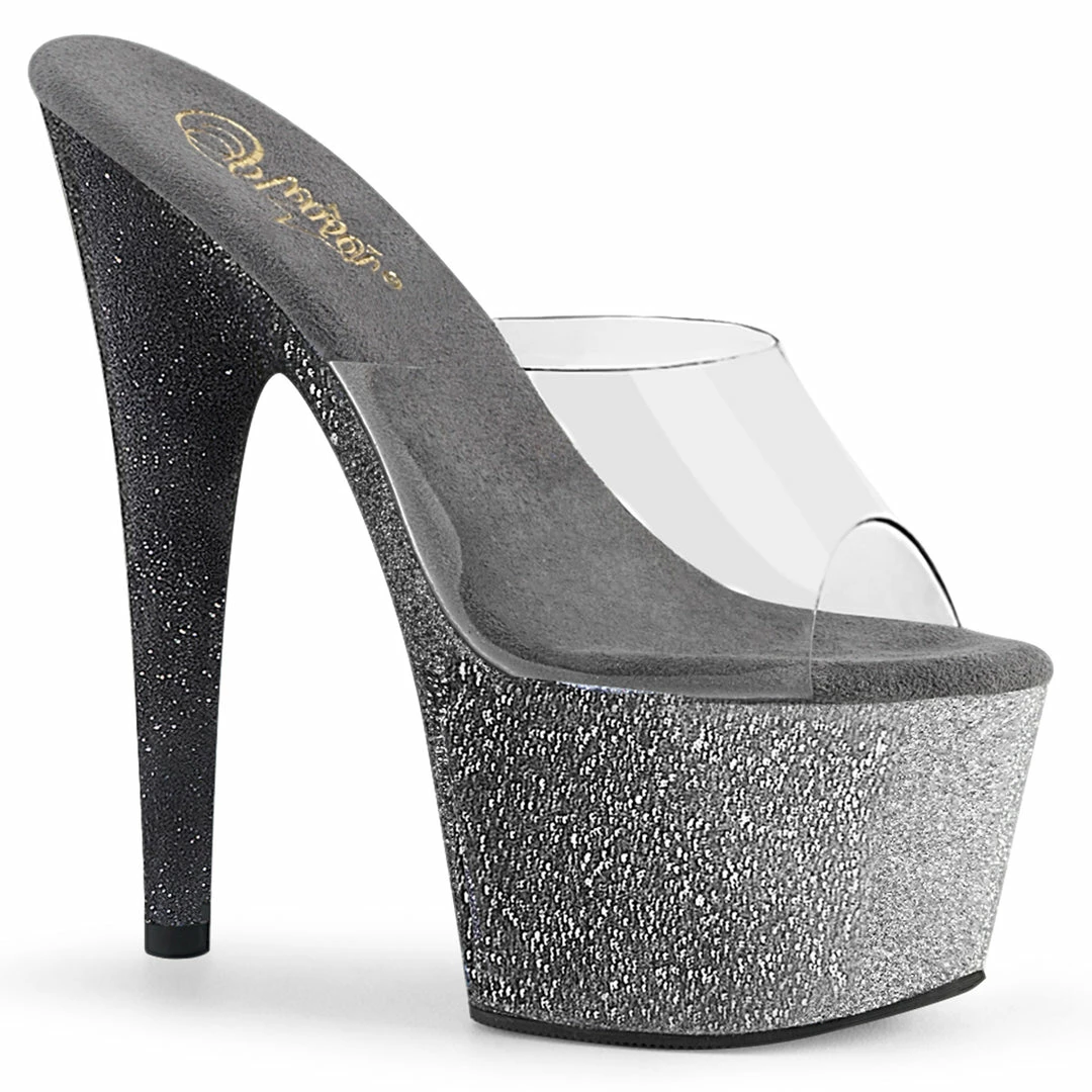 7″ (17.8cm) Stiletto heel, 2 3/4″ (7cm) platform slide featuring the entire platform bottom covered with multi colored glitters for an ombre effect.