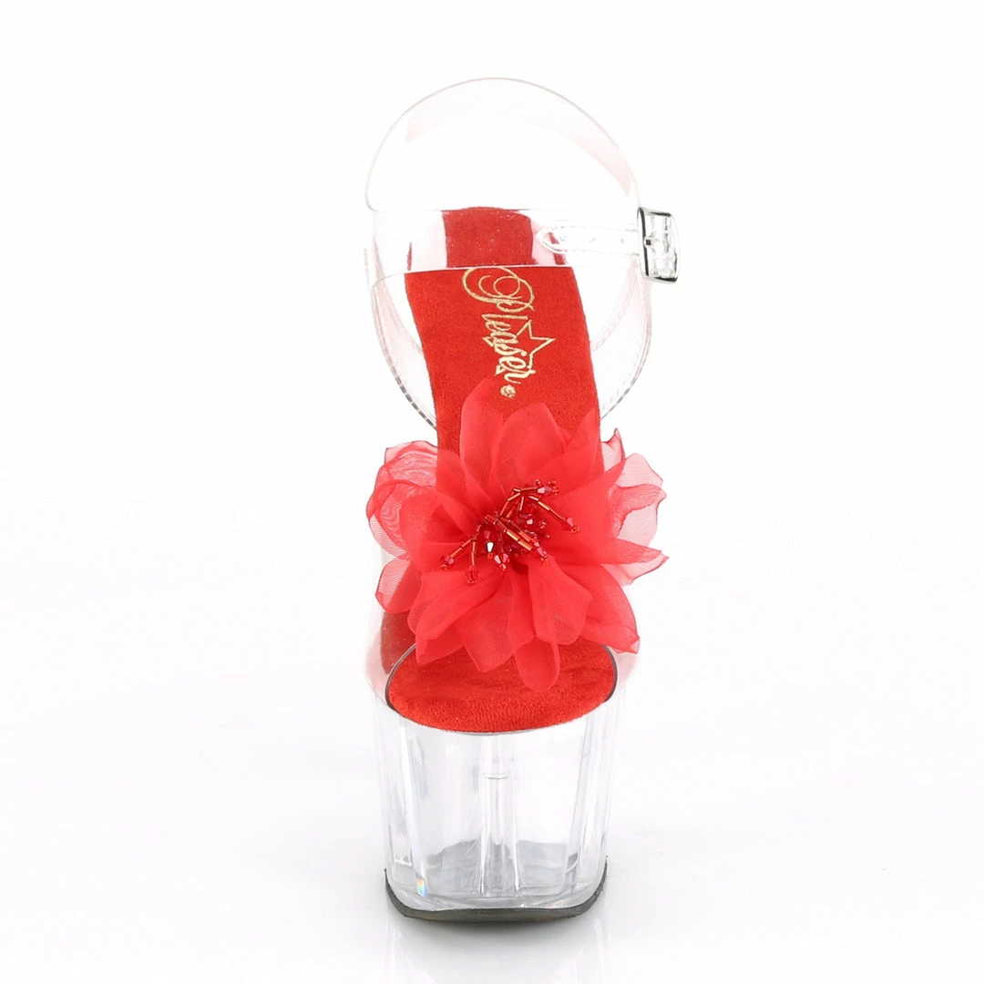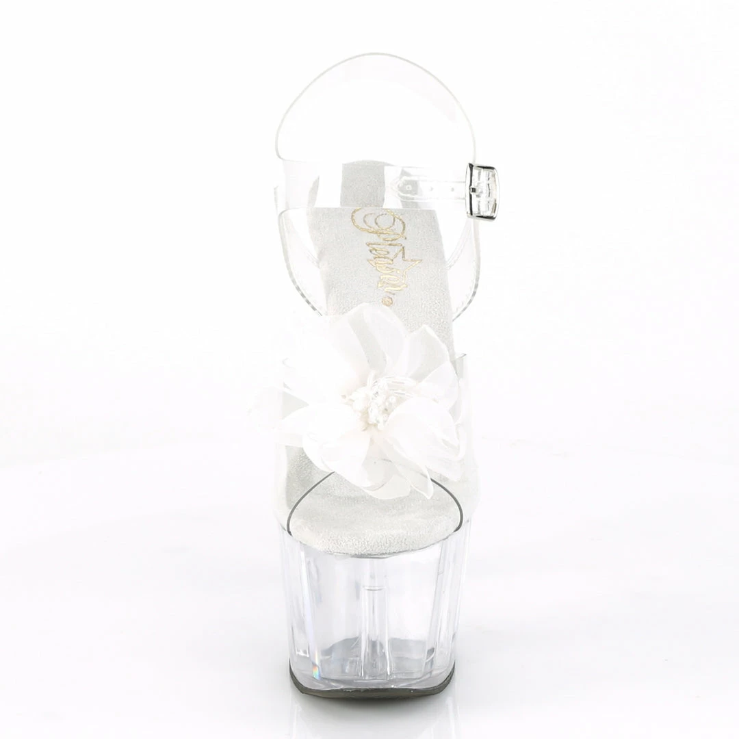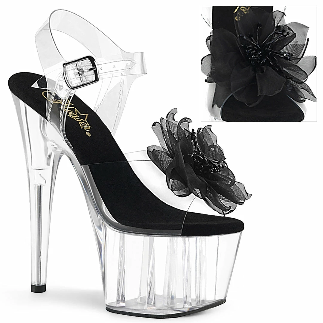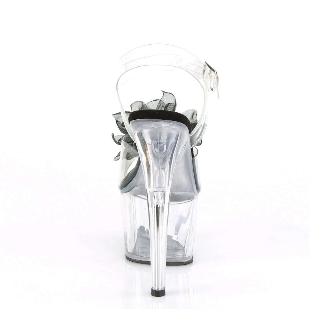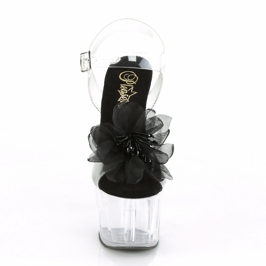 7″ (17.8cm) heel, 2 3/4″ (7cm) platform ankle strap sandal featuring sheer organza flower with beads at toe.