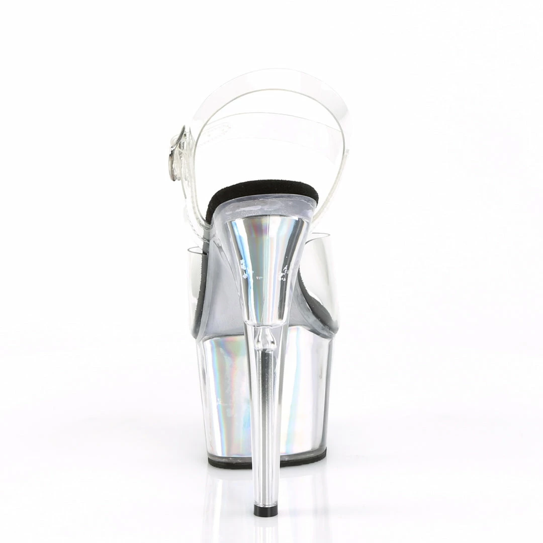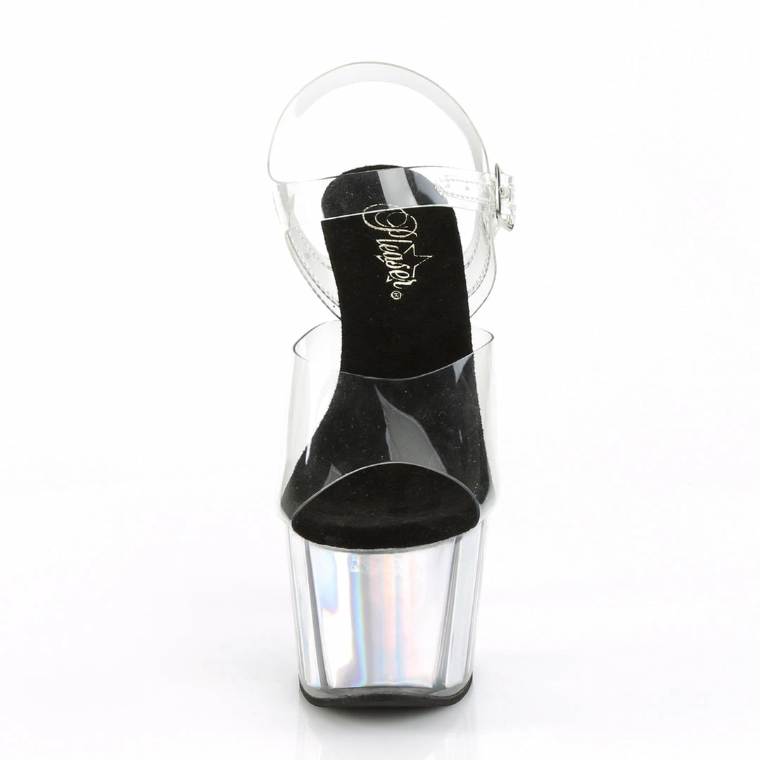 7″ (17.8cm) Stiletto heel, 2 3/4″ (7cm) platform ankle strap sandal featuring holographic inserts in the platform bottom.