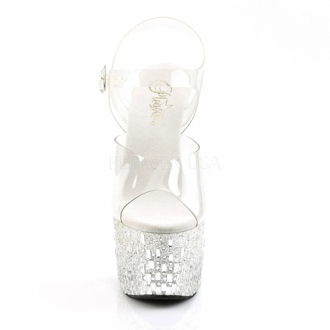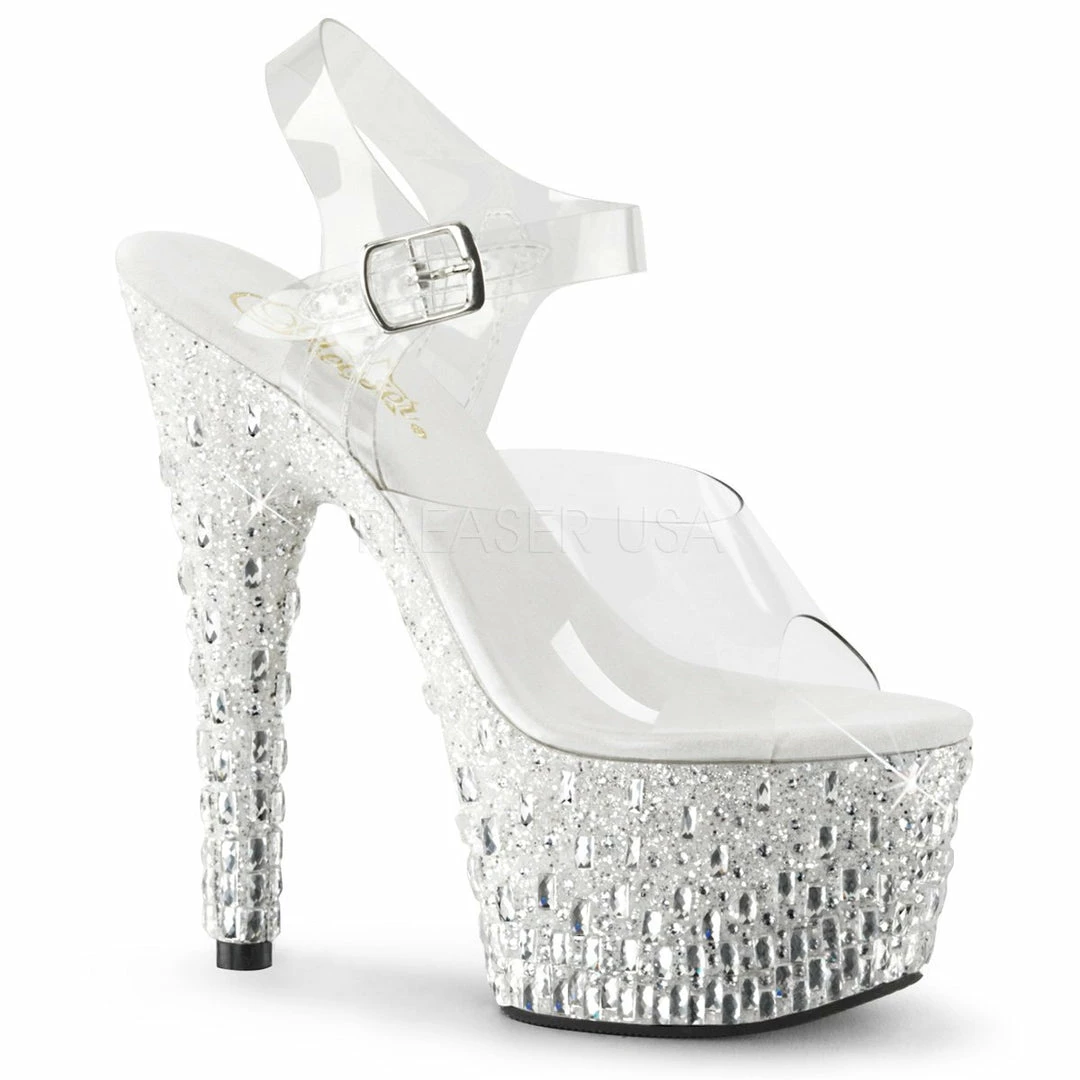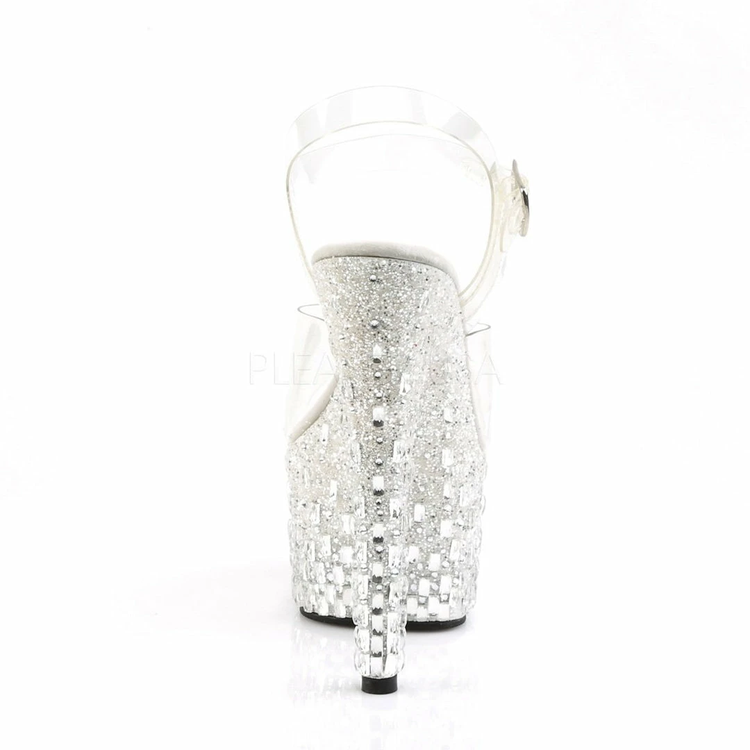 7″ (17.8cm) Stiletto heel, 2 3/4″ (7cm) platform ankle strap sandal featuring entire platform bottom embellished with silver glitter and stones.