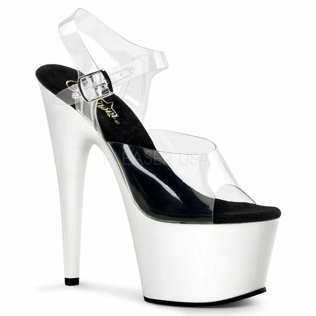 7″ (17.8cm) Stiletto heel, 2 3/4″ (7cm) platform ankle strap neon bottom sandal.