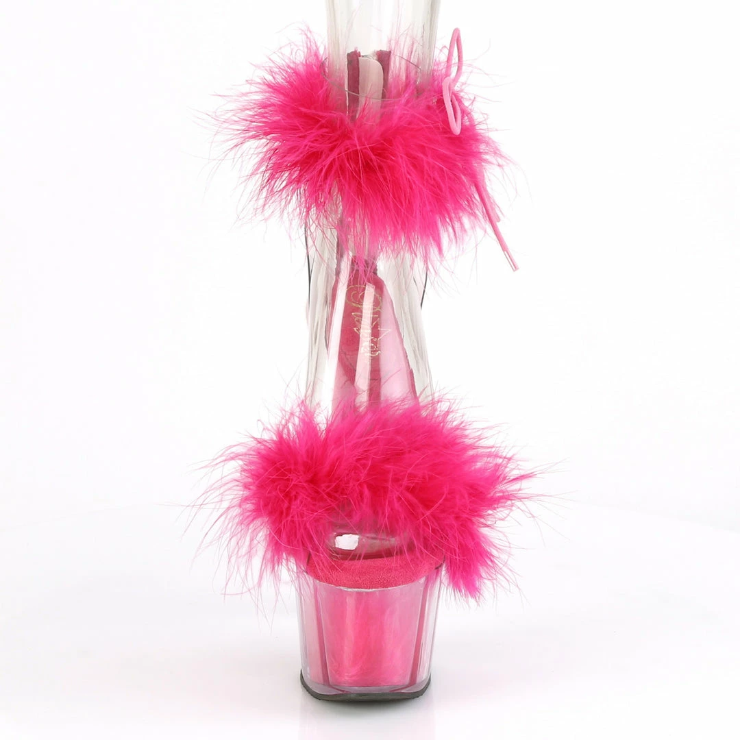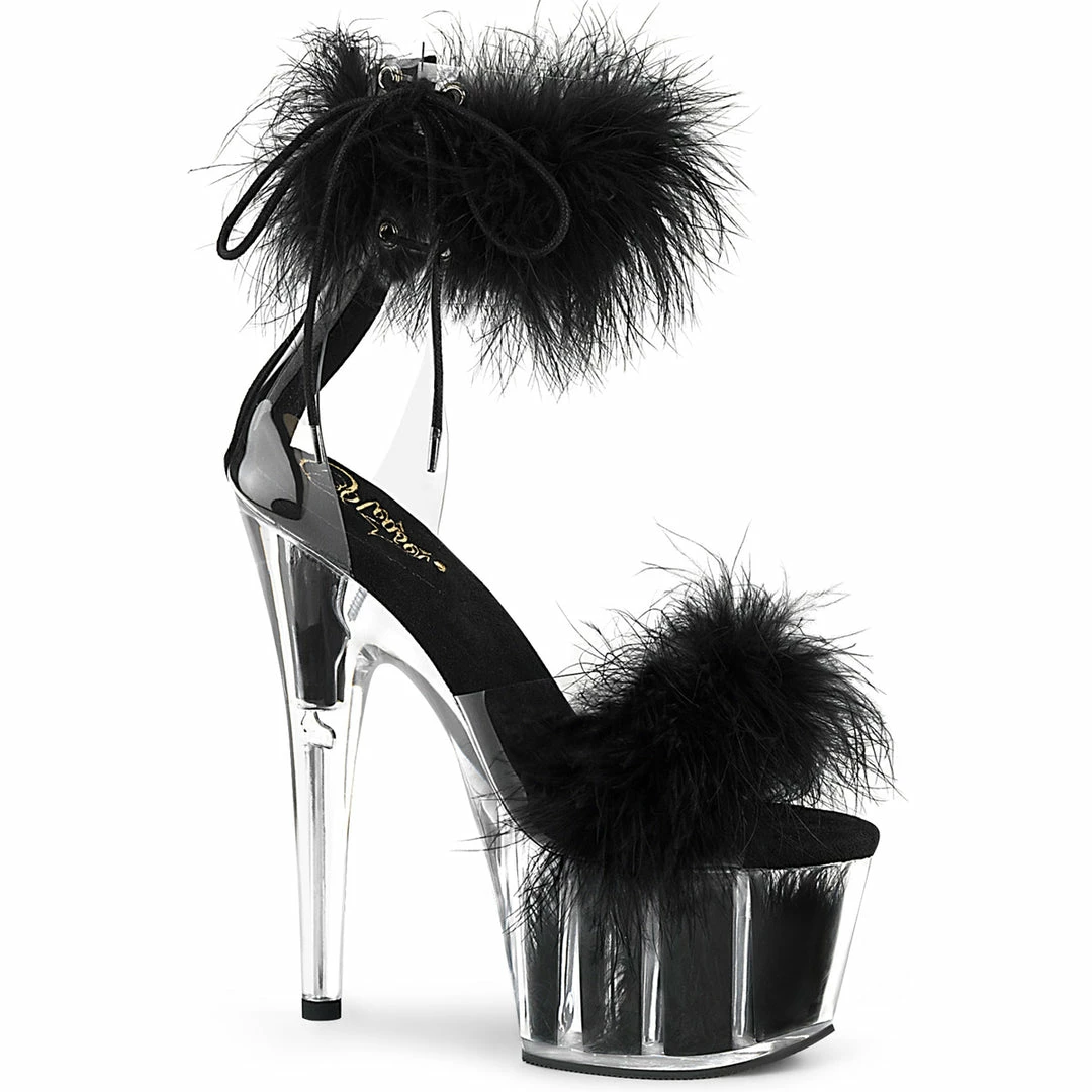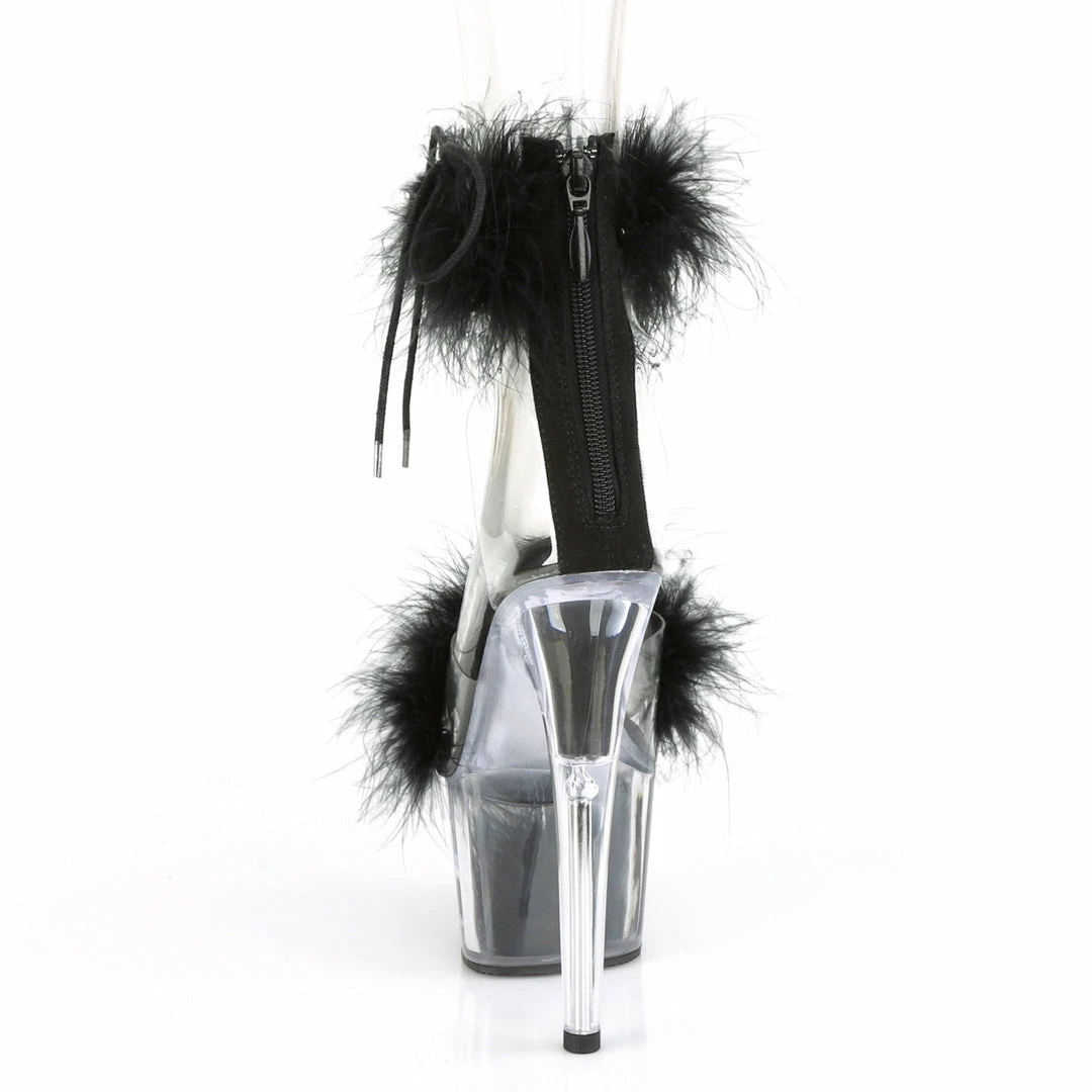 7″ (17.8cm) heel, 2 3/4″ (7cm) platform close back ankle cuff sandal featuring marabou fur on vamp and inside the platform bottom, side lacing and back zip closure.