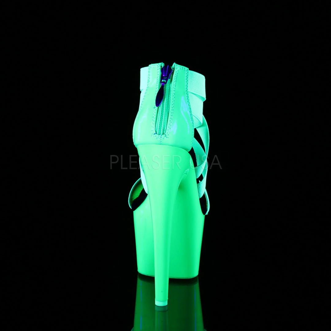7″ (17.8cm) Stiletto heel, 2 3/4″ (7cm) platform criss-cross sandal featuring entire upper, platform bottom and outsole/toplift UV blacklight reactive.