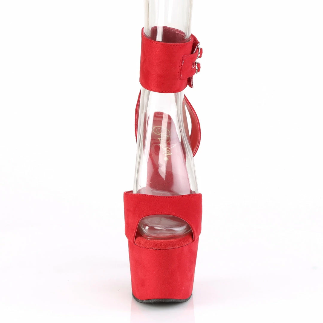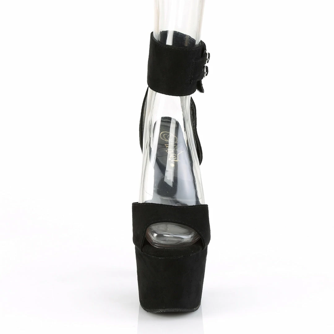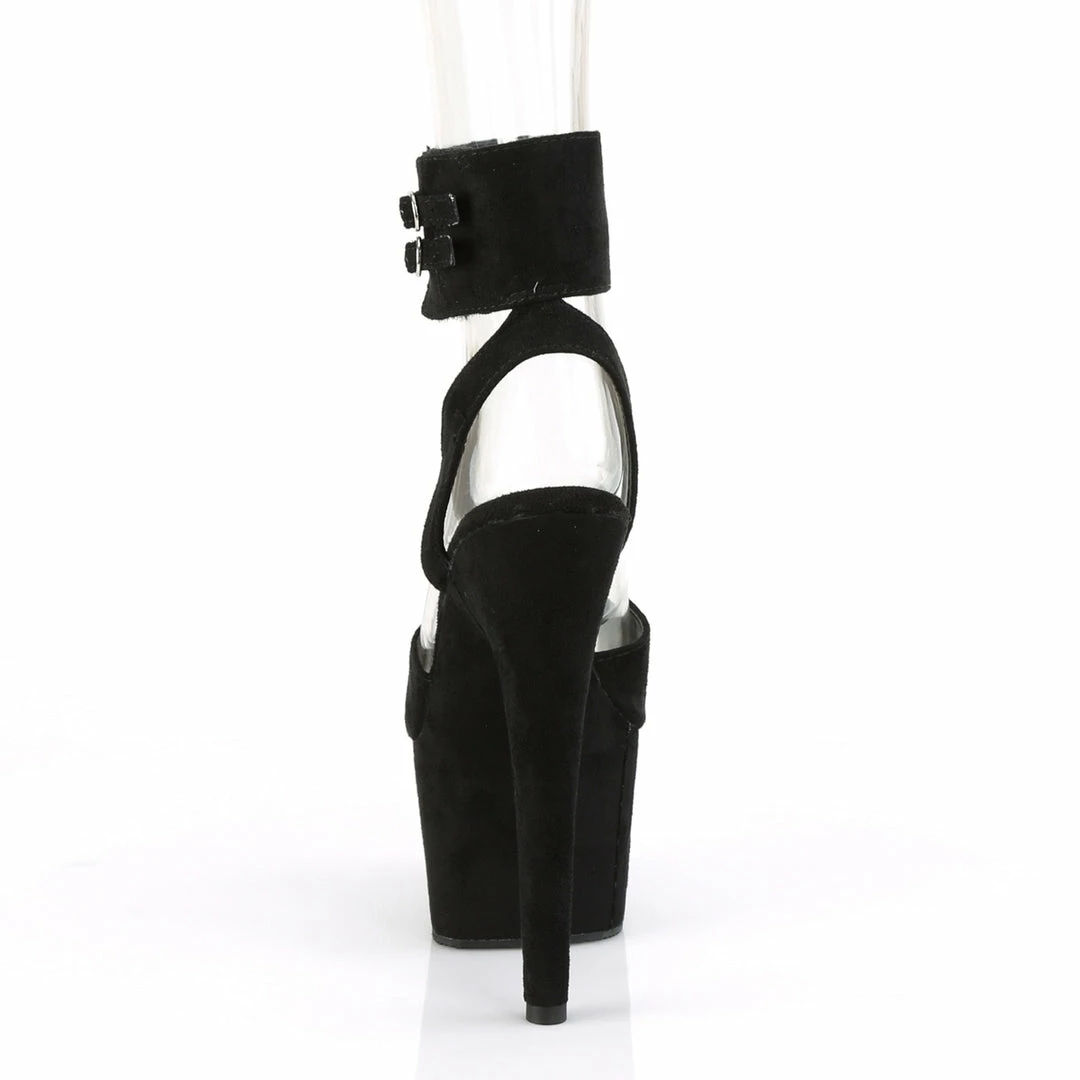 7″ (17.8cm) Stiletto heel, 2 3/4″ (7cm) platform ankle strap sandal featuring wide ankle band with dual buckle straps.