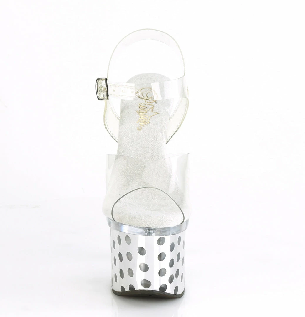 7″ (17.8cm) heel, 3″ (7.6cm) platform USB chargeable LED light-up ankle strap sandal with multicolor disco lighting effects in various patterns/settings featuring chrome plated platform with dots.