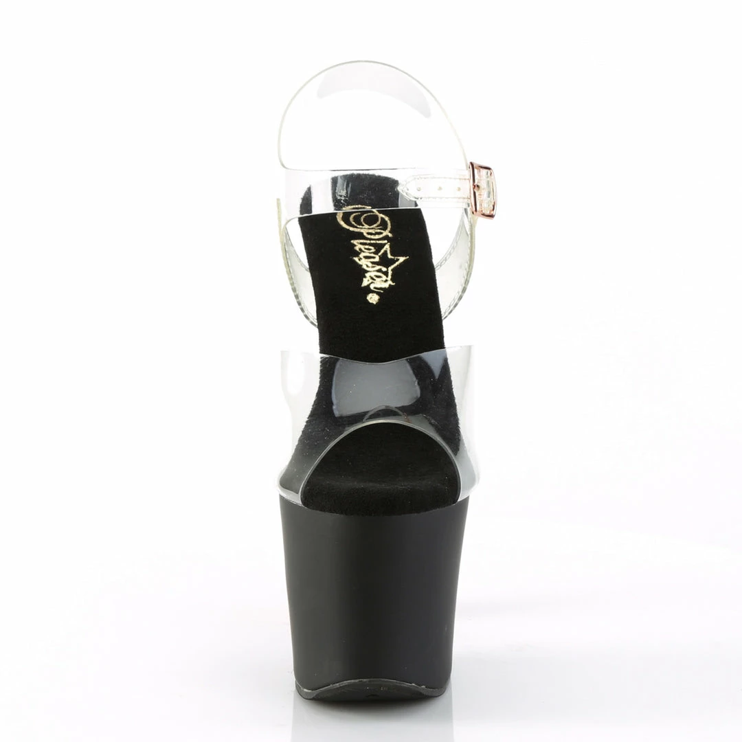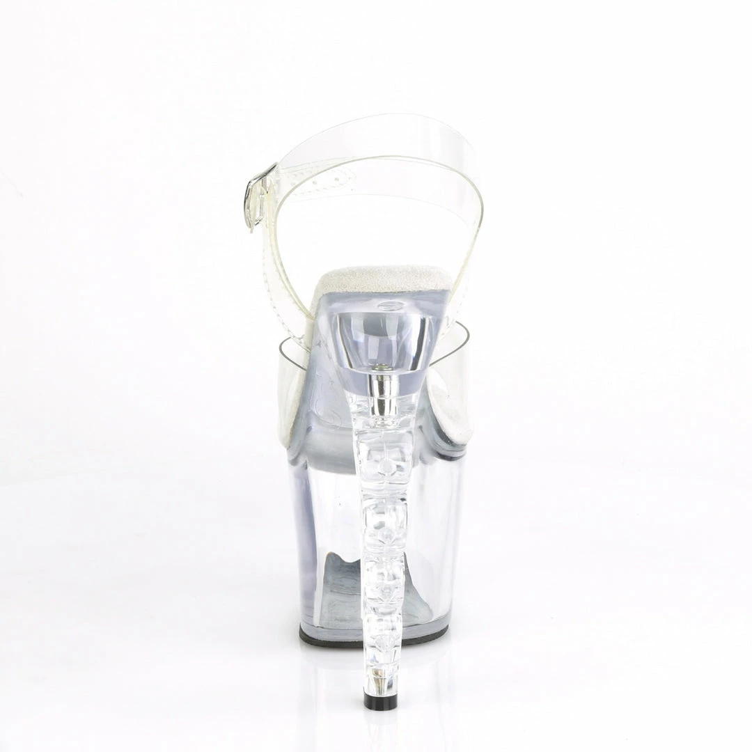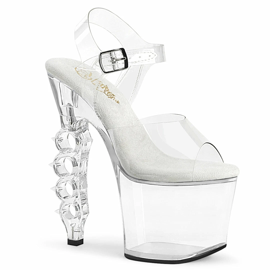 7″ (17.8cm) heel, 3 1/4″ (8.3cm) platform ankle strap sandal featuring brass knuckles heel.