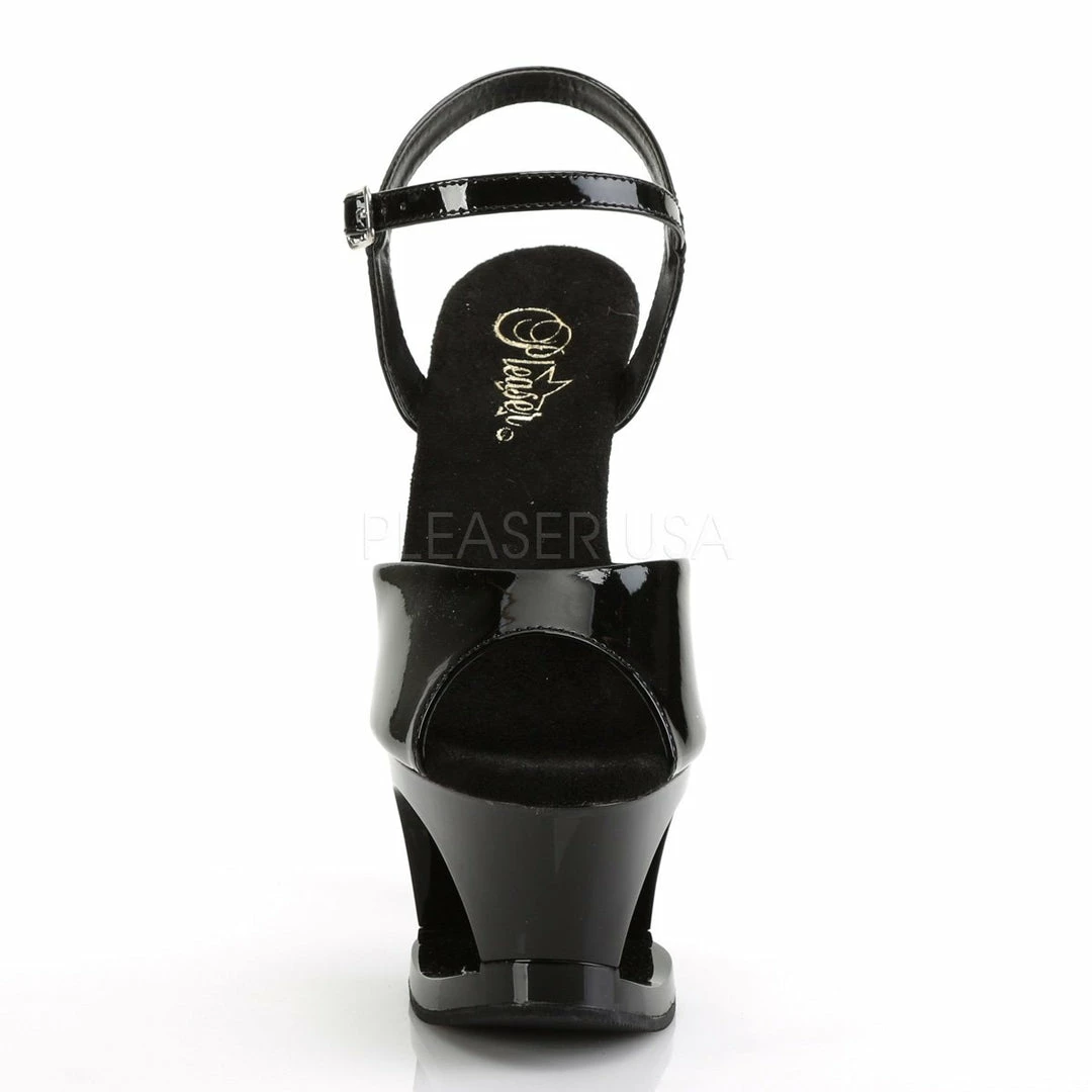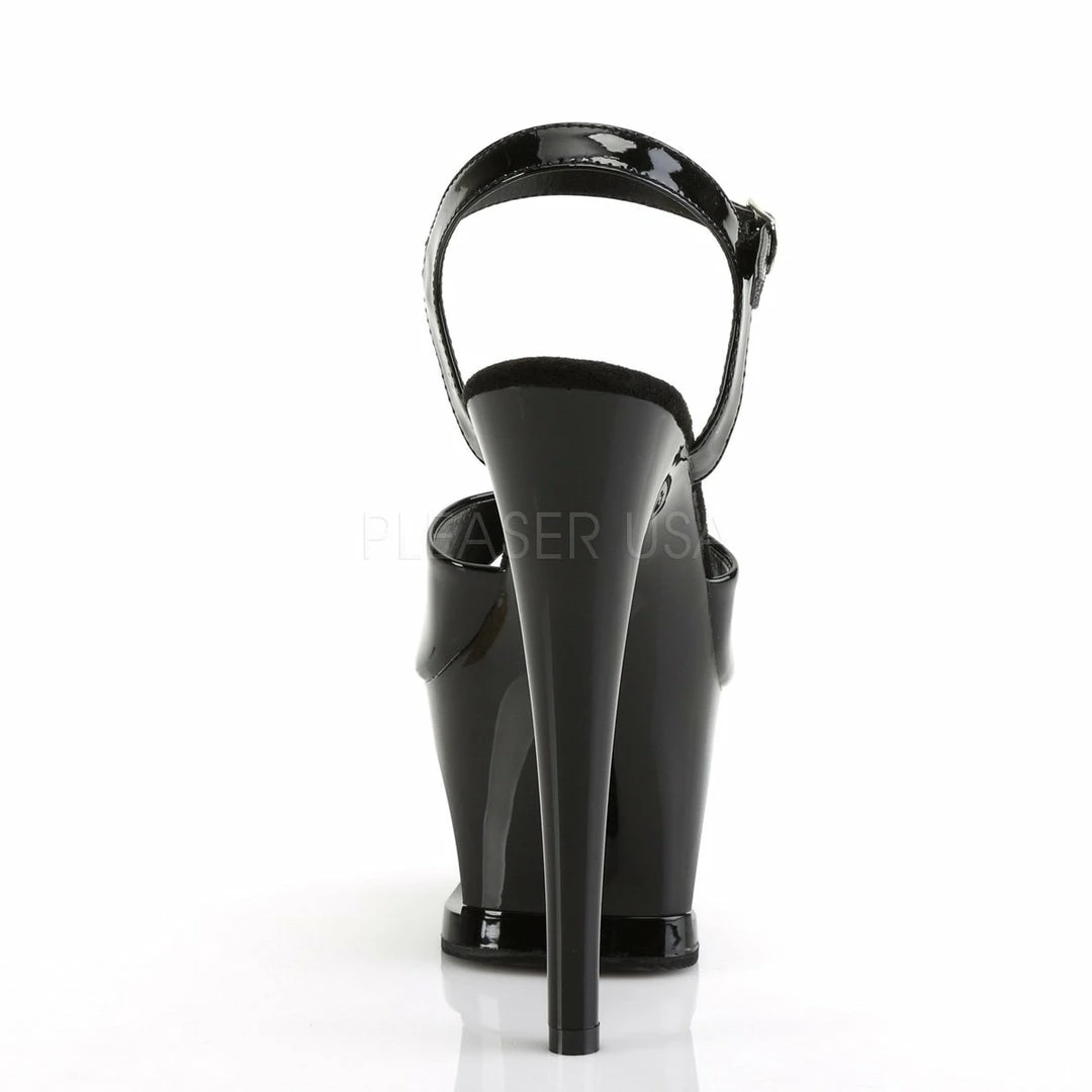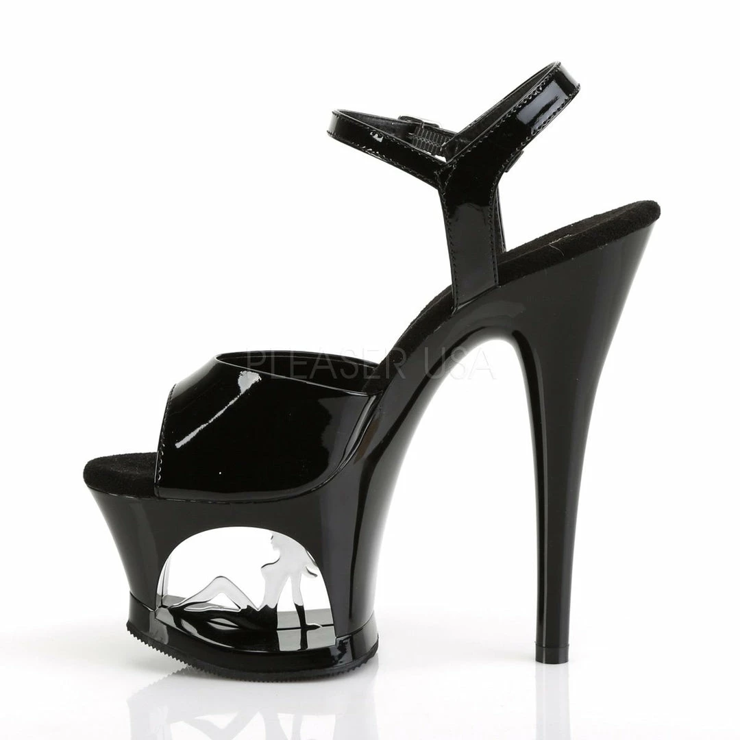 7″ (17.8cm) heel, 2 3/4″ (7cm) cut out platform ankle strap sandal featuring trucker girl in the platform.