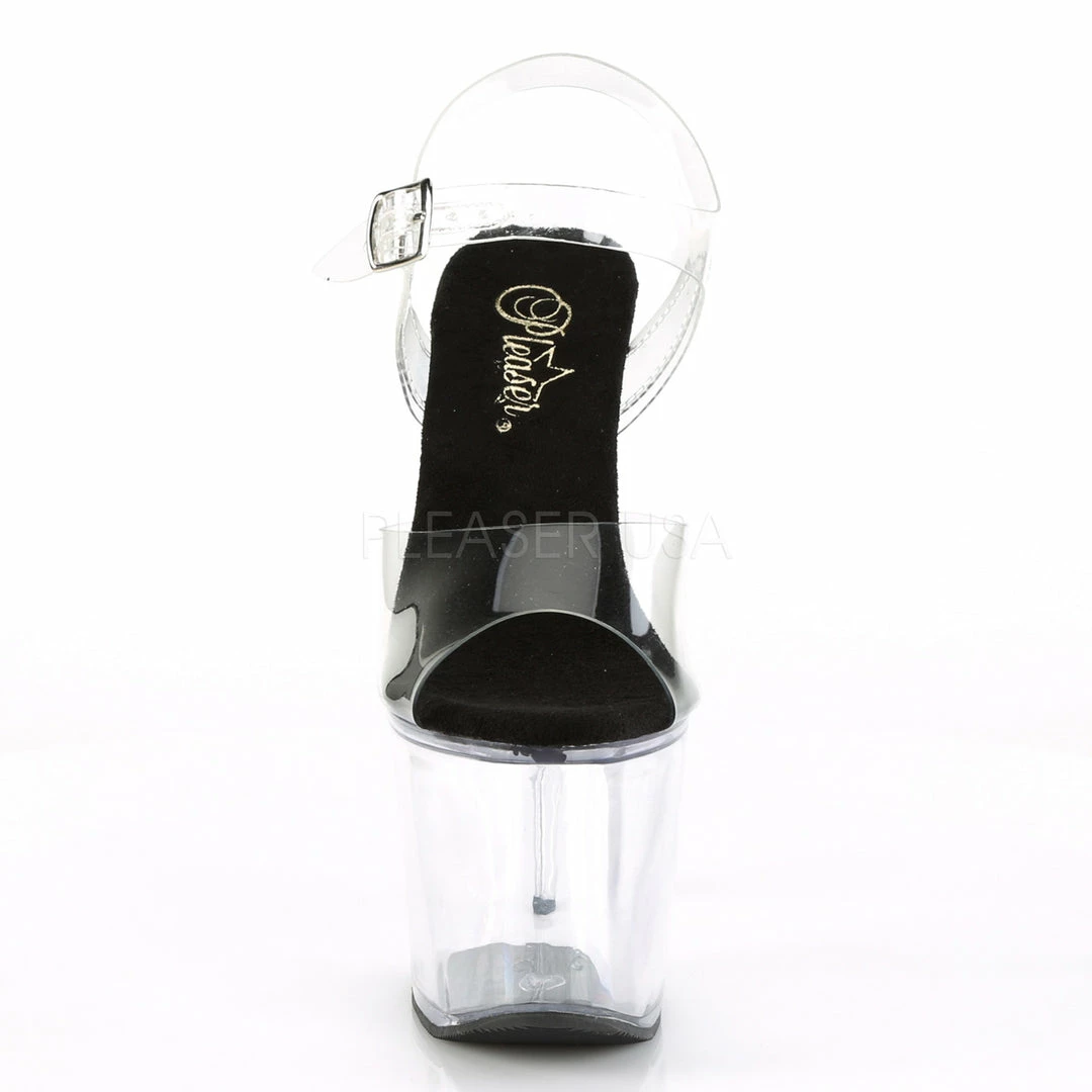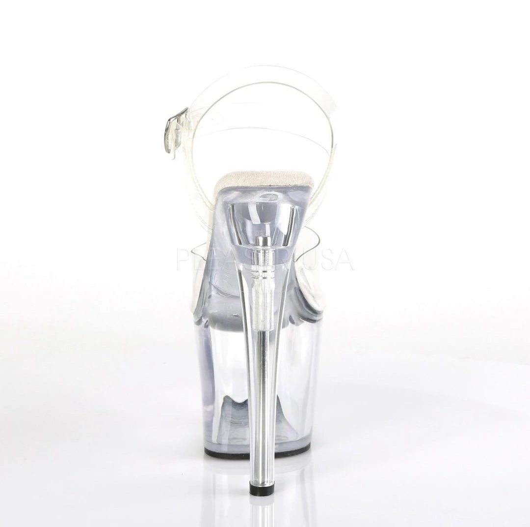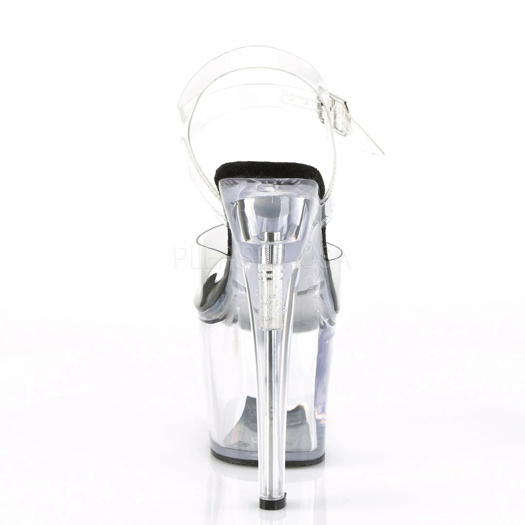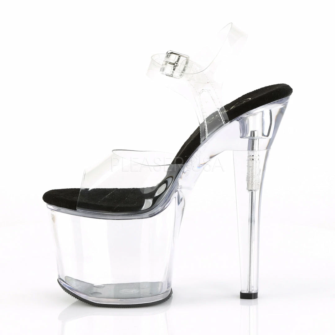 7″ (17.8cm) heel, 3 1/4″ (8.3cm) platform ankle strap sandal.