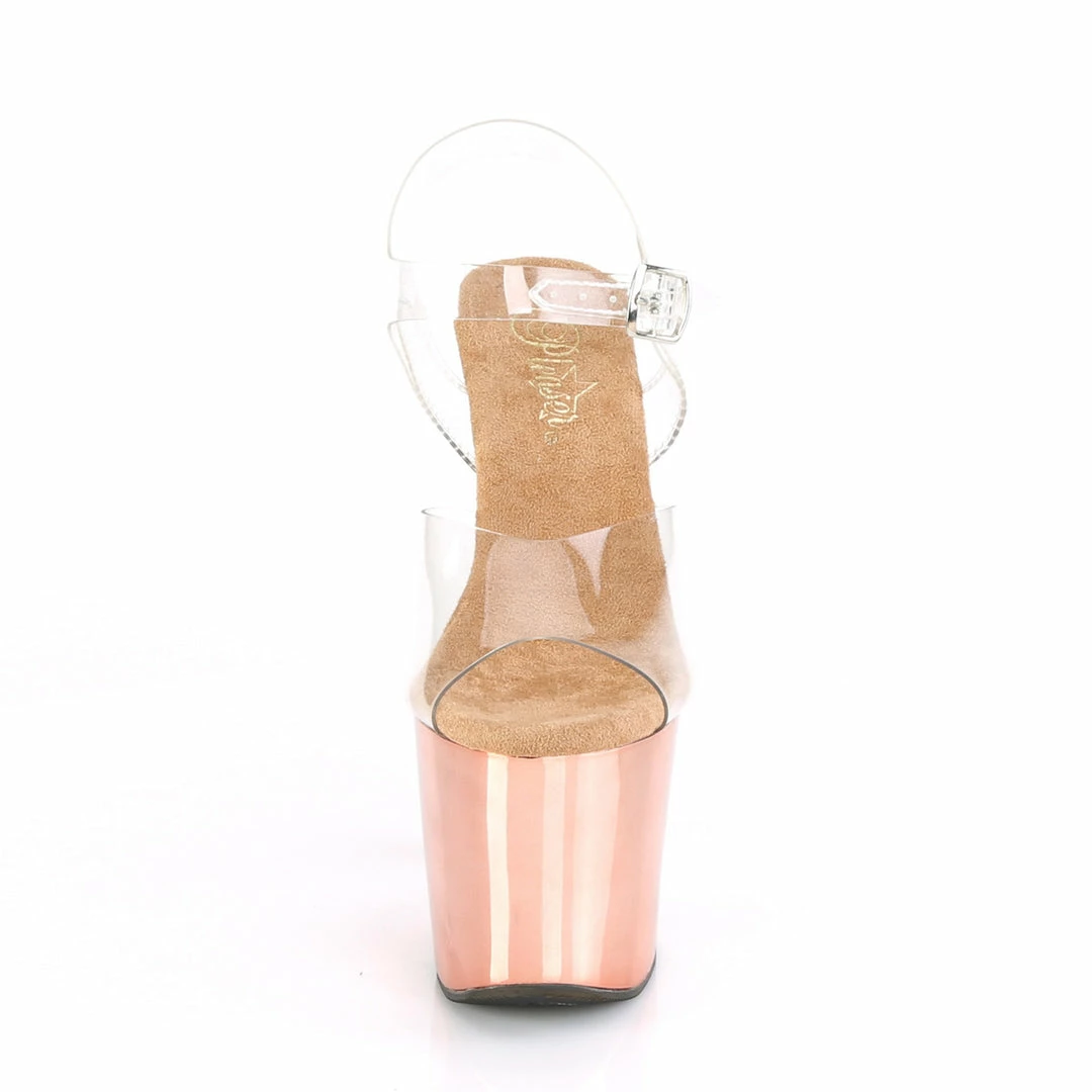 7″ (17.8cm) heel, 3 1/4″ (8.3cm) chrome plated platform ankle strap sandal.