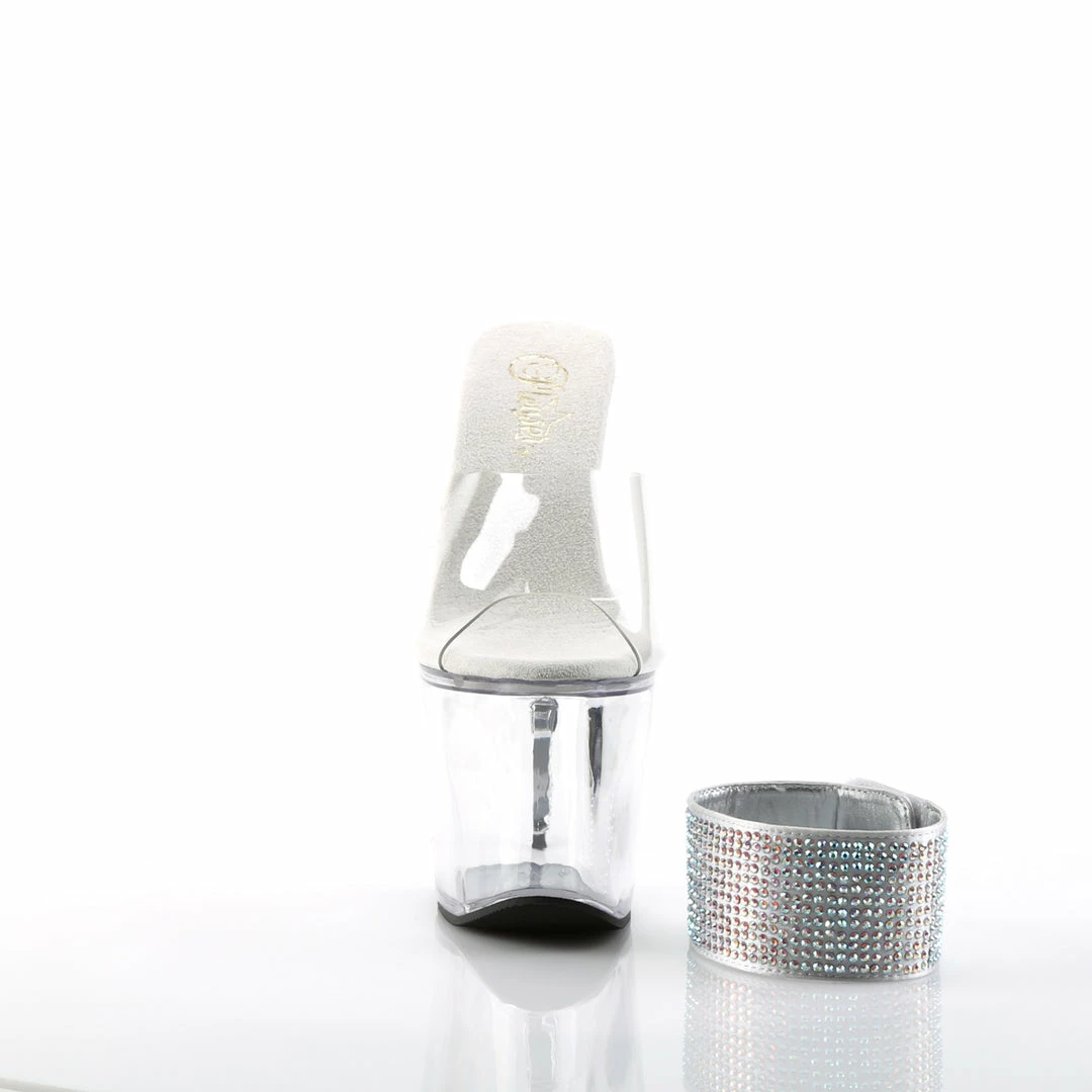 7″ (17.8cm) Rhinestone embellished gun heel, 3 1/4″ (8.3cm) platform slide featuring rhinestone covered ankle cuff.