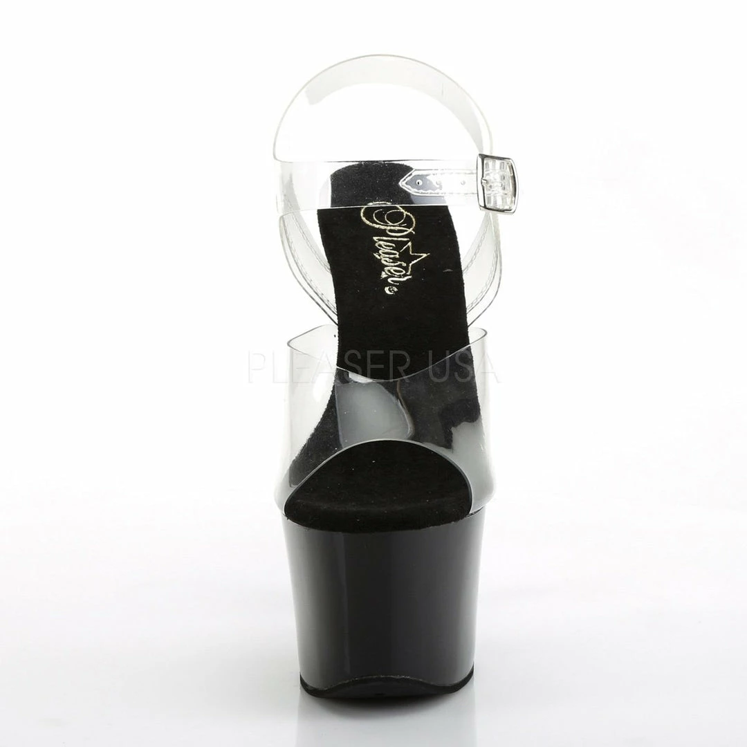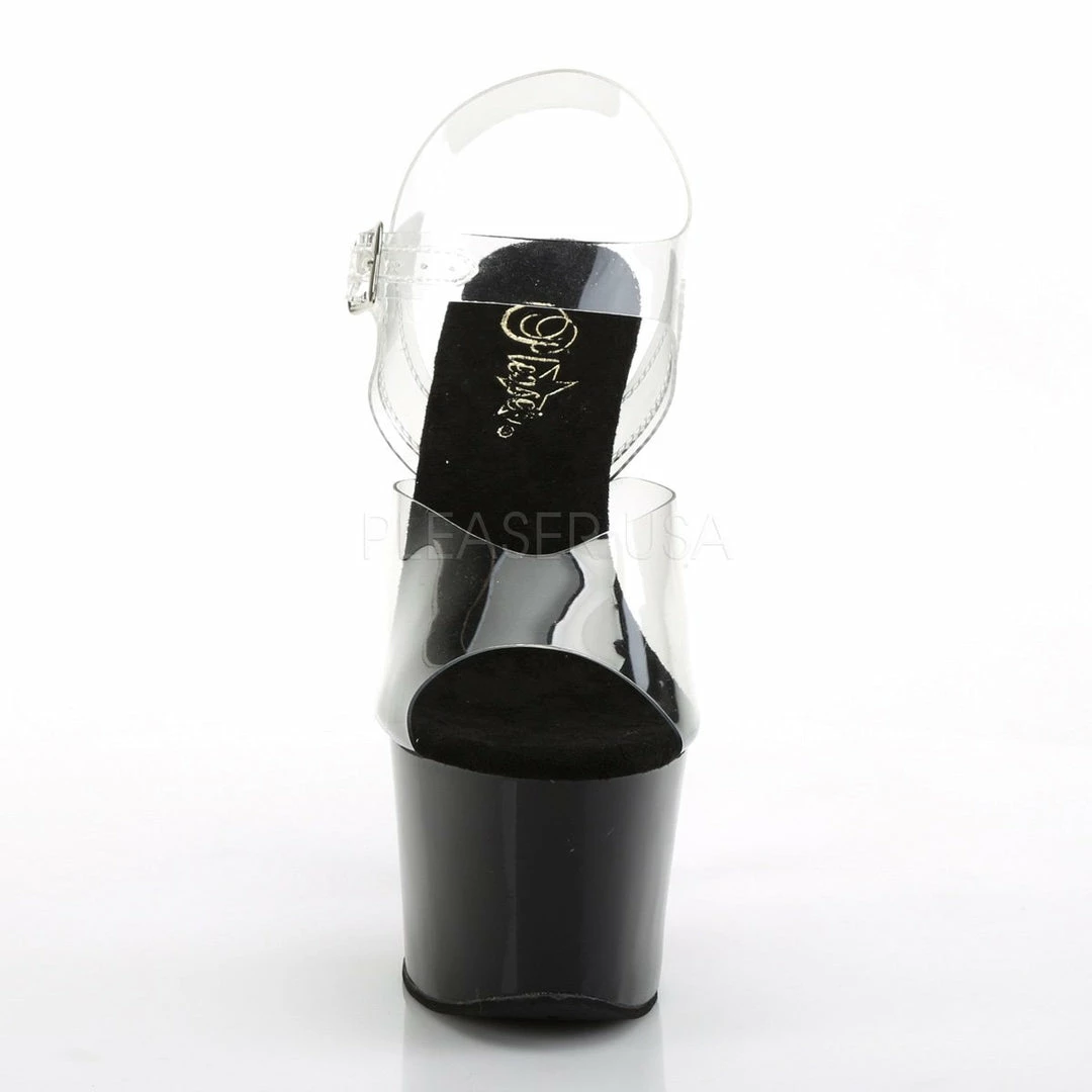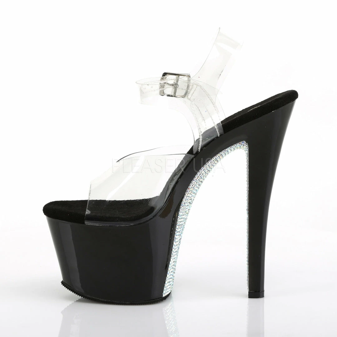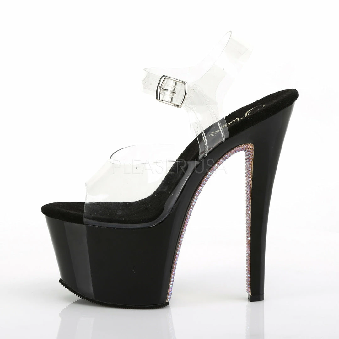 7″ (17.8cm) heel, 2 3/4″ (7cm) platform ankle strap sandal with contrast rhinestones on the platform bottom.