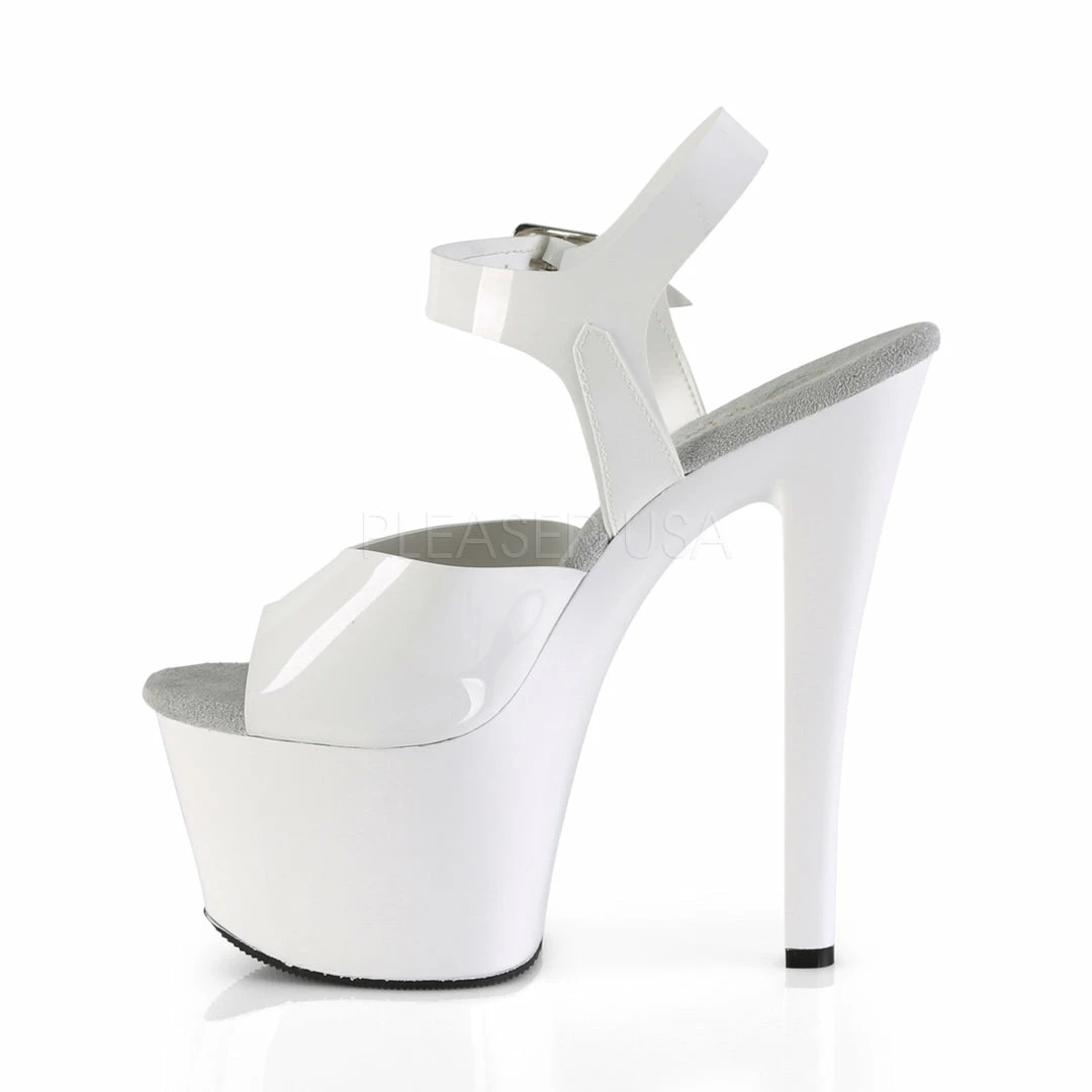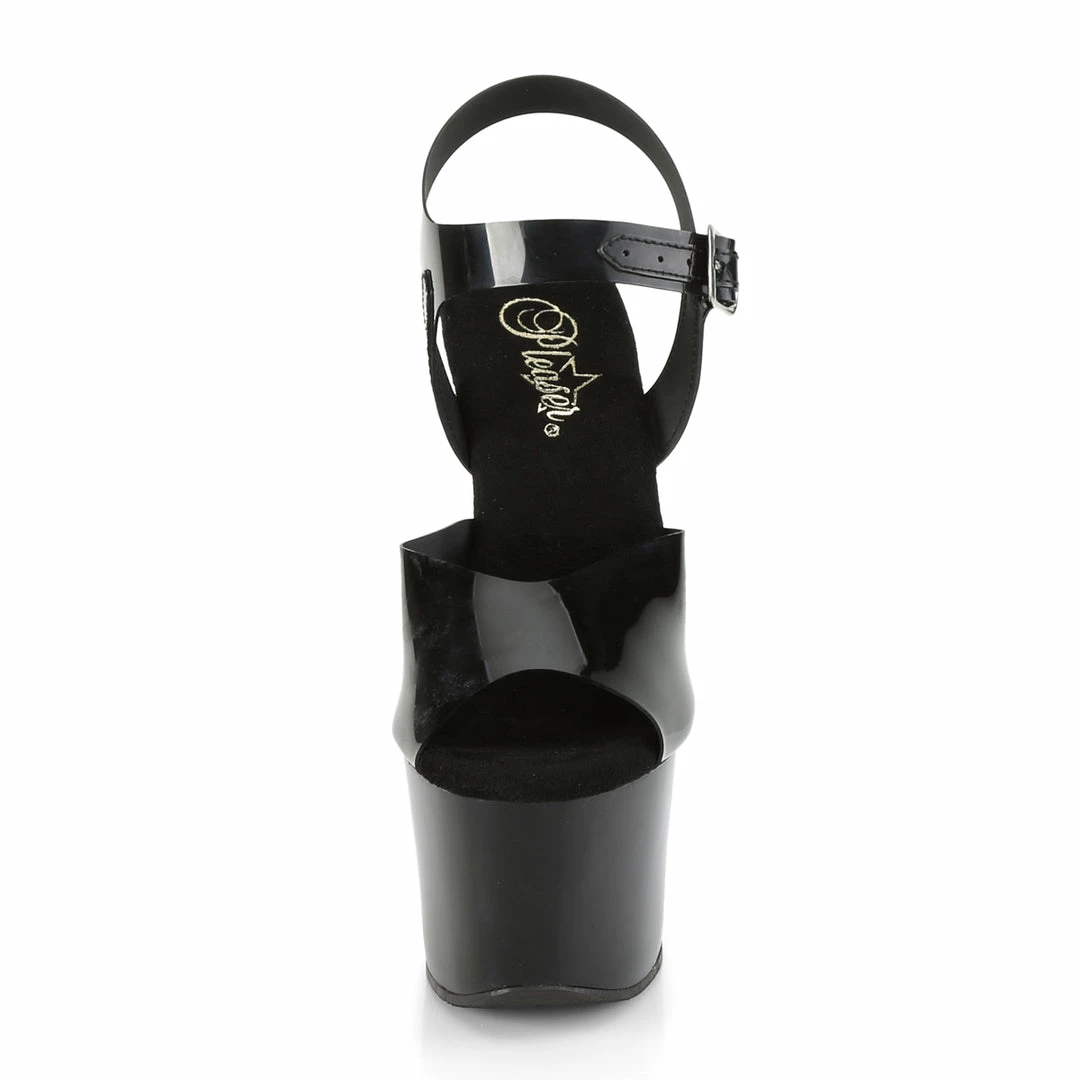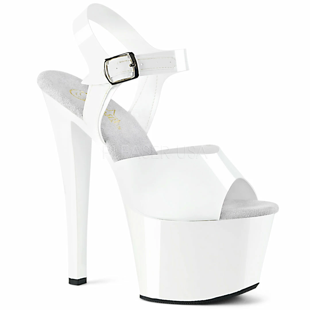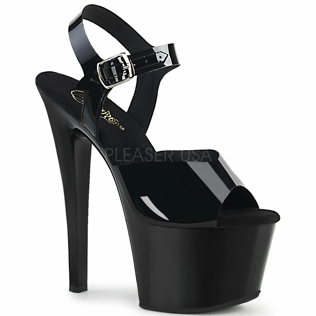 7″ (17.8cm) heel, 2 3/4″ (7cm) platform ankle strap sandal.