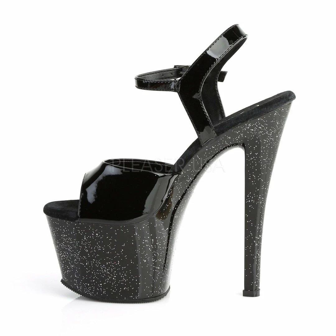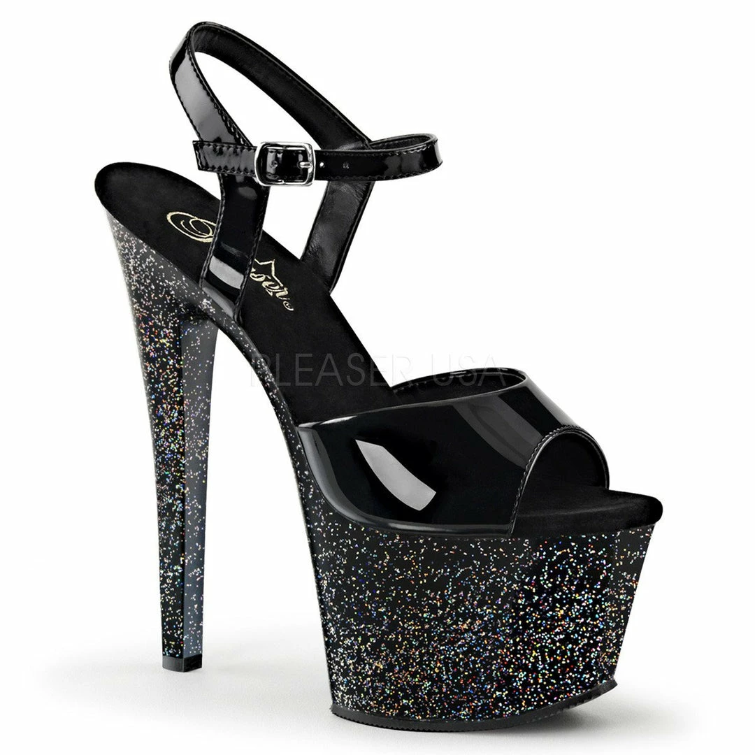 7″ (17.8cm) heel, 2 3/4″ (7cm) platform ankle strap sandal featuring mini iridescent glitters on entire bottom.