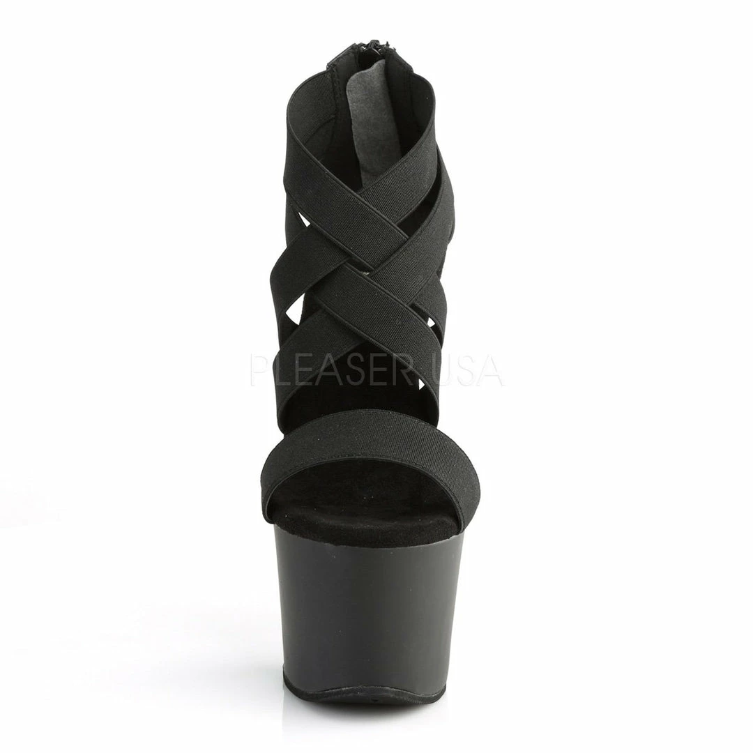 7″ (17.8cm) heel, 2 3/4″ (7cm) platform double criss cross close back sandal with back zip closure.