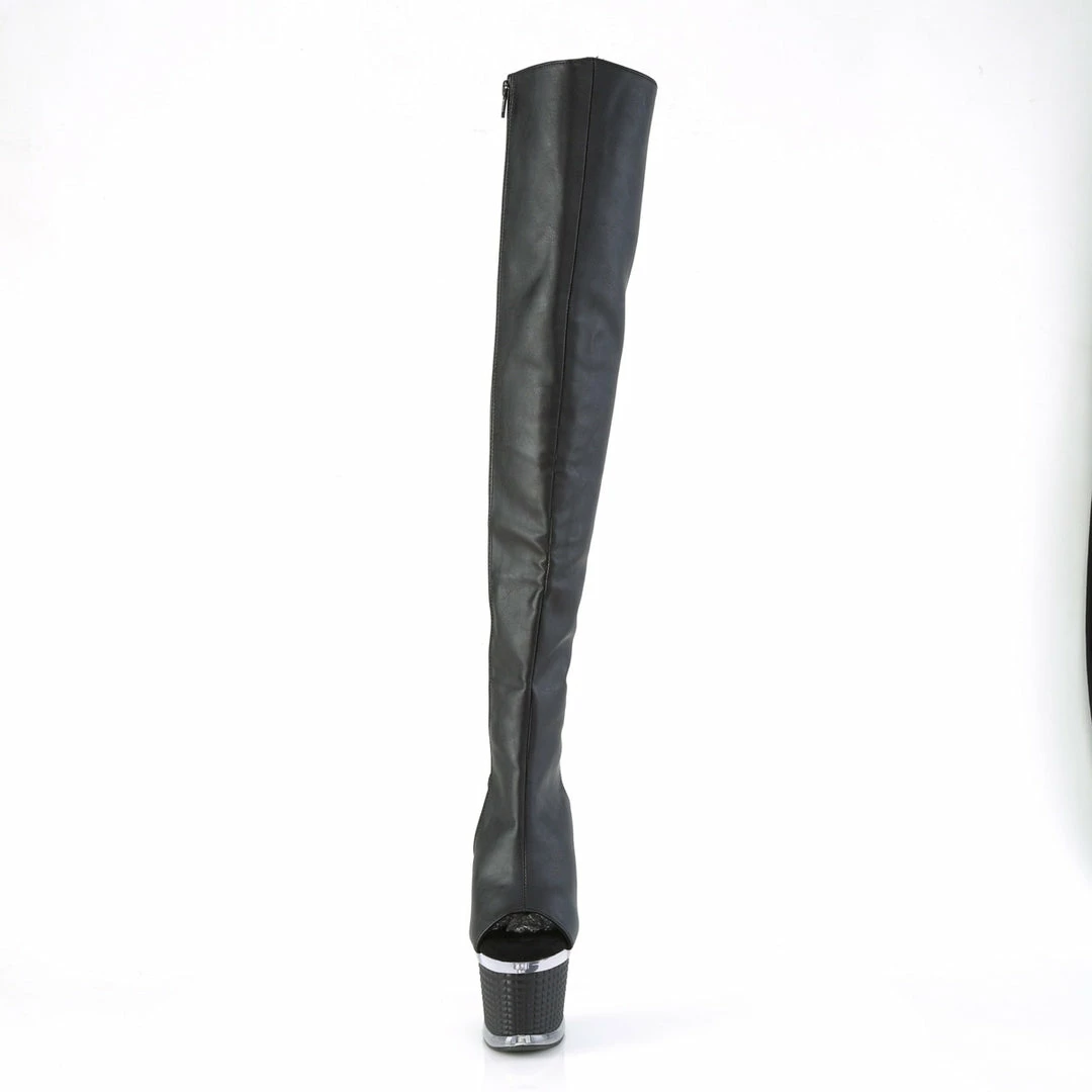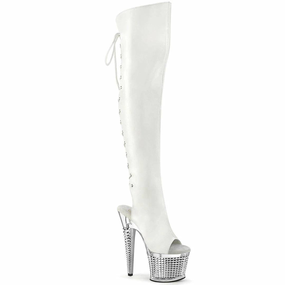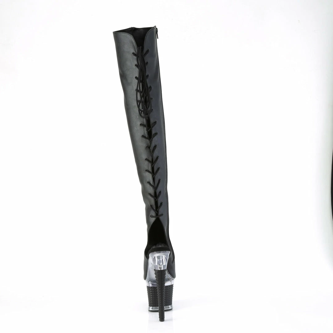 7″ (17.8cm) heel, 3″ (7.6cm) Textured platform open toe/heel, lace-up back thigh high boot with inside zip closure.