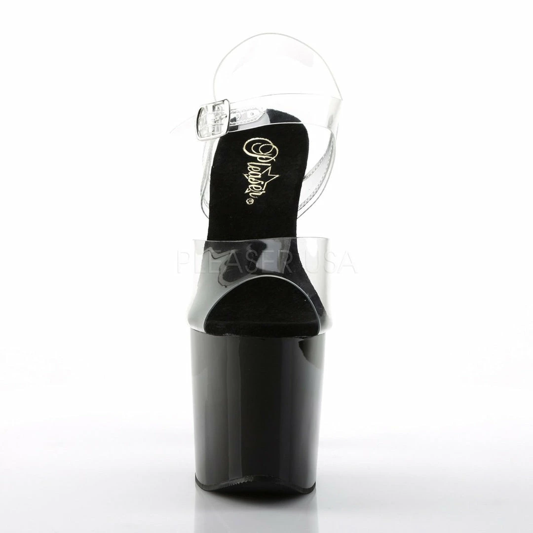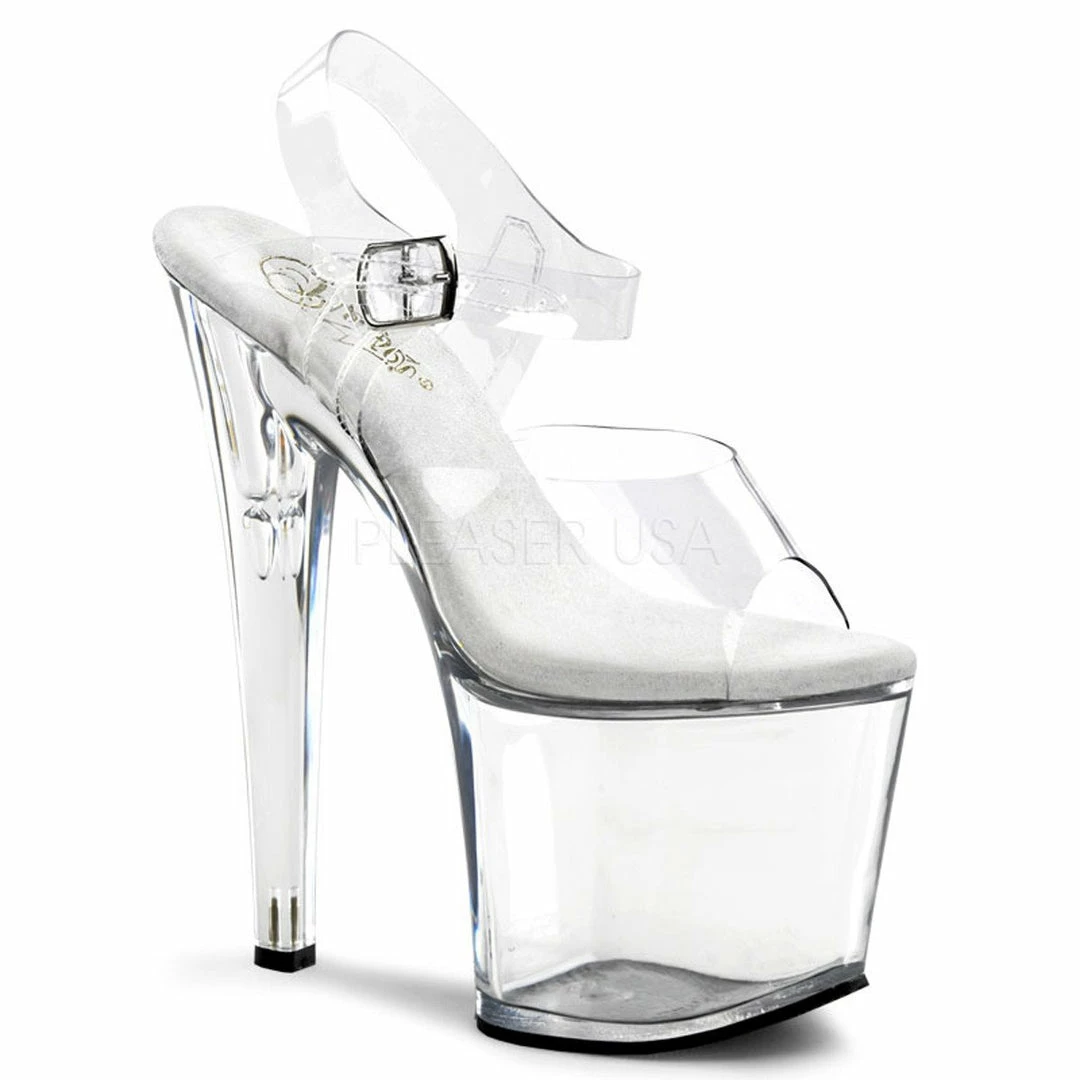 7 1/2″ (19.1cm) heel, 3 1/2″ (8.9cm) platform ankle strap sandal.