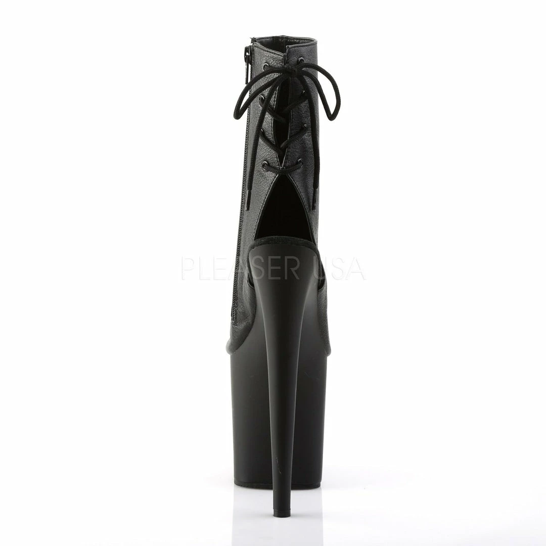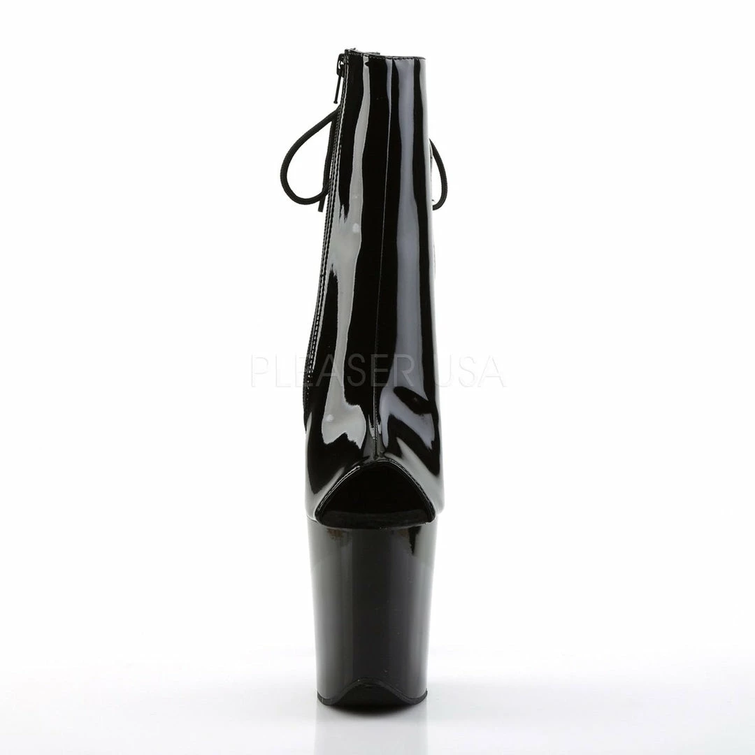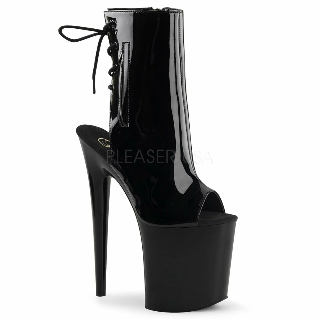 8″ (20cm) heel, 4″ (10cm) platform open toe/heel back lace-up ankle boot with inside zip closure.