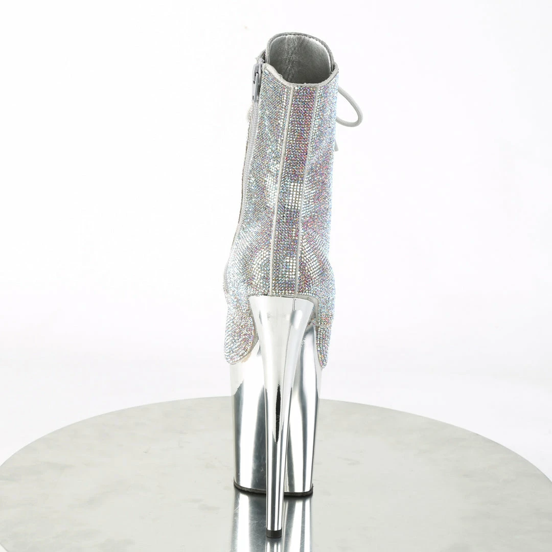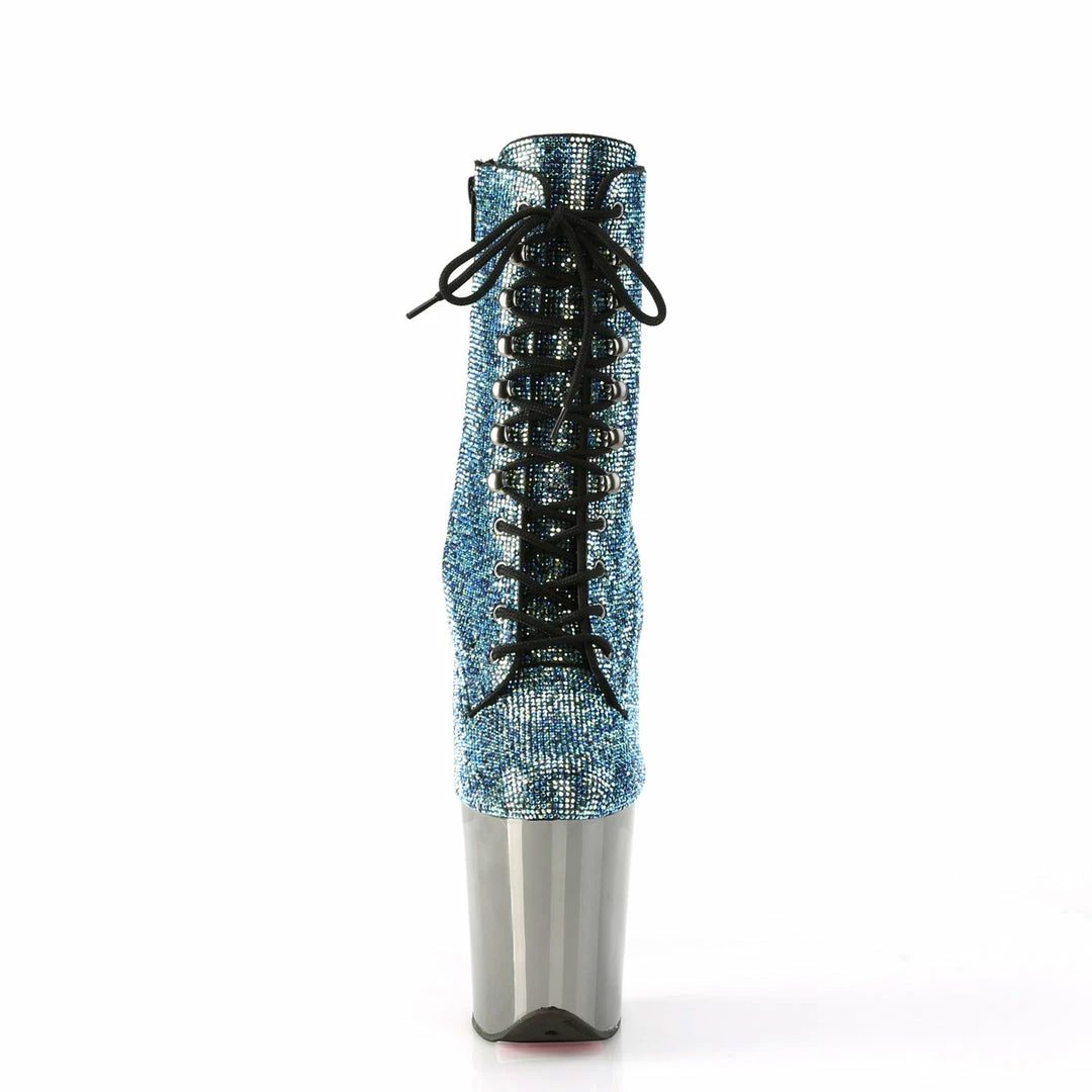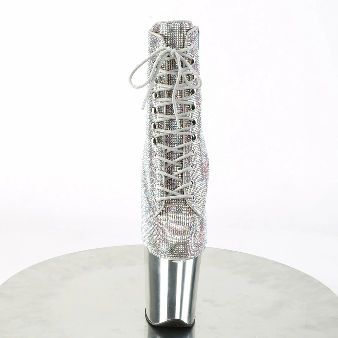 8″ (20cm) Heel, 4″ (10cm) Platform lace-up ankle boot featuring chrome plated platform bottom and all over blanketed rhinestone embellishments on upper, inside zip closure.