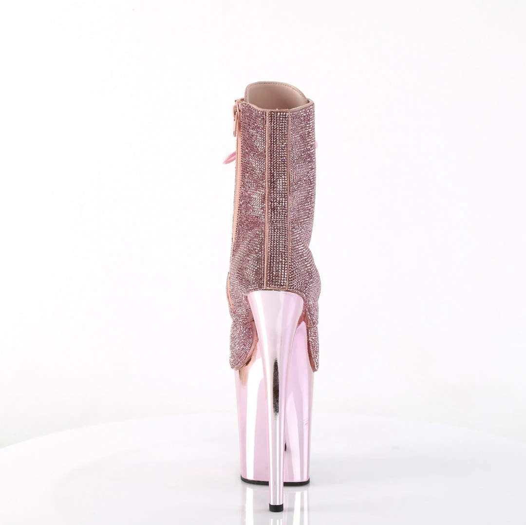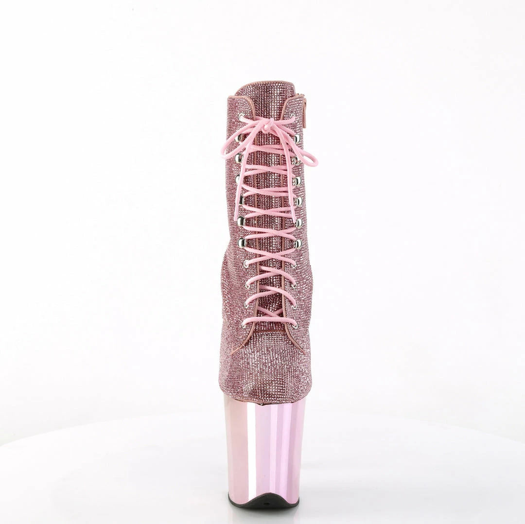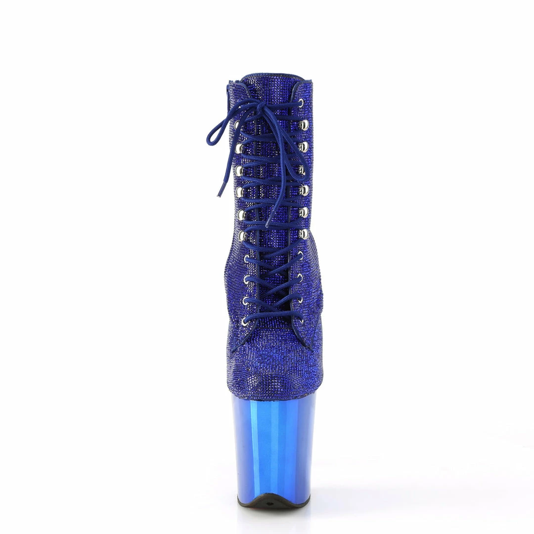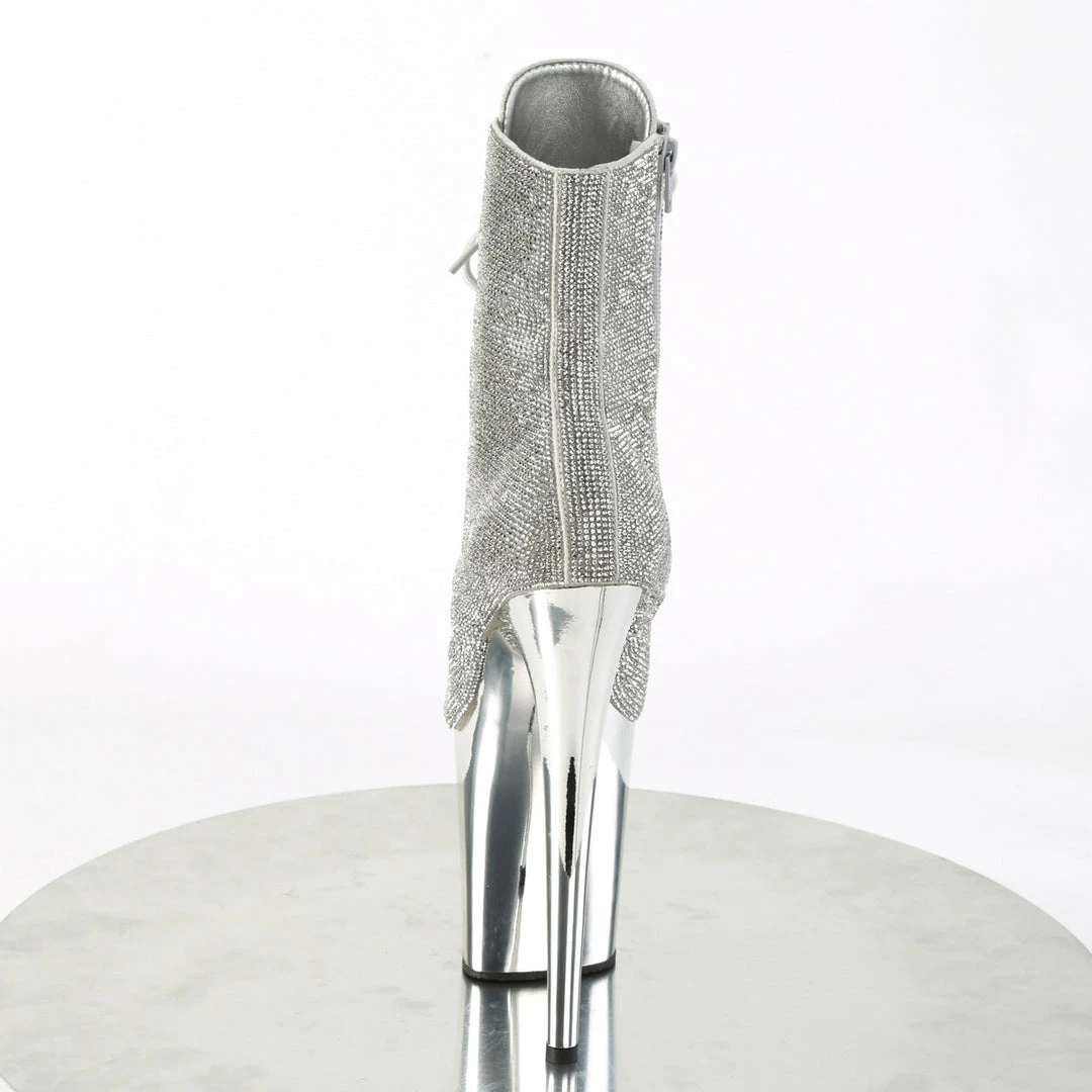 8″ (20cm) Heel, 4″ (10cm) Platform lace-up ankle boot featuring chrome plated platform bottom and all over blanketed rhinestone embellishments on upper, inside zip closure.