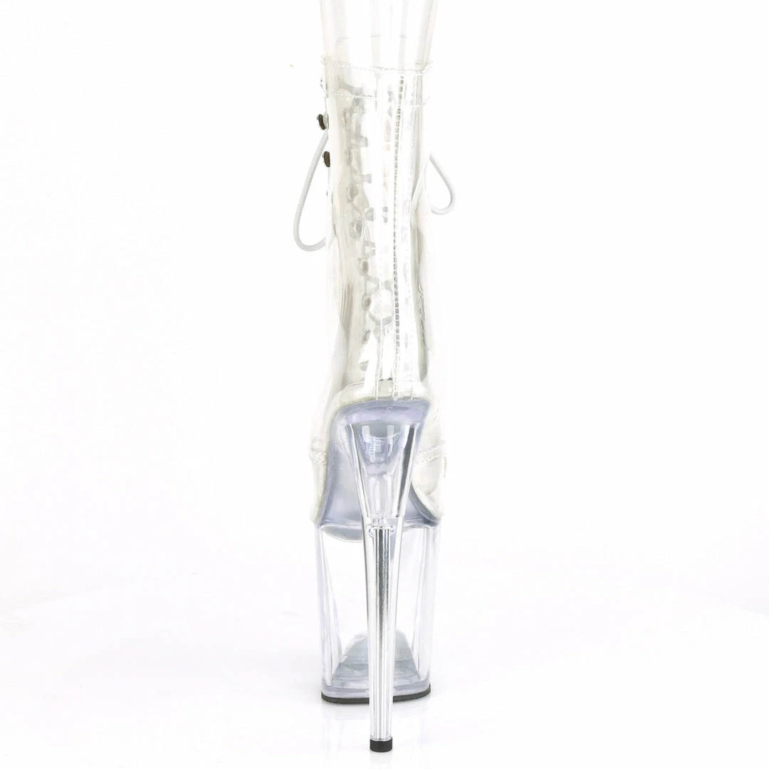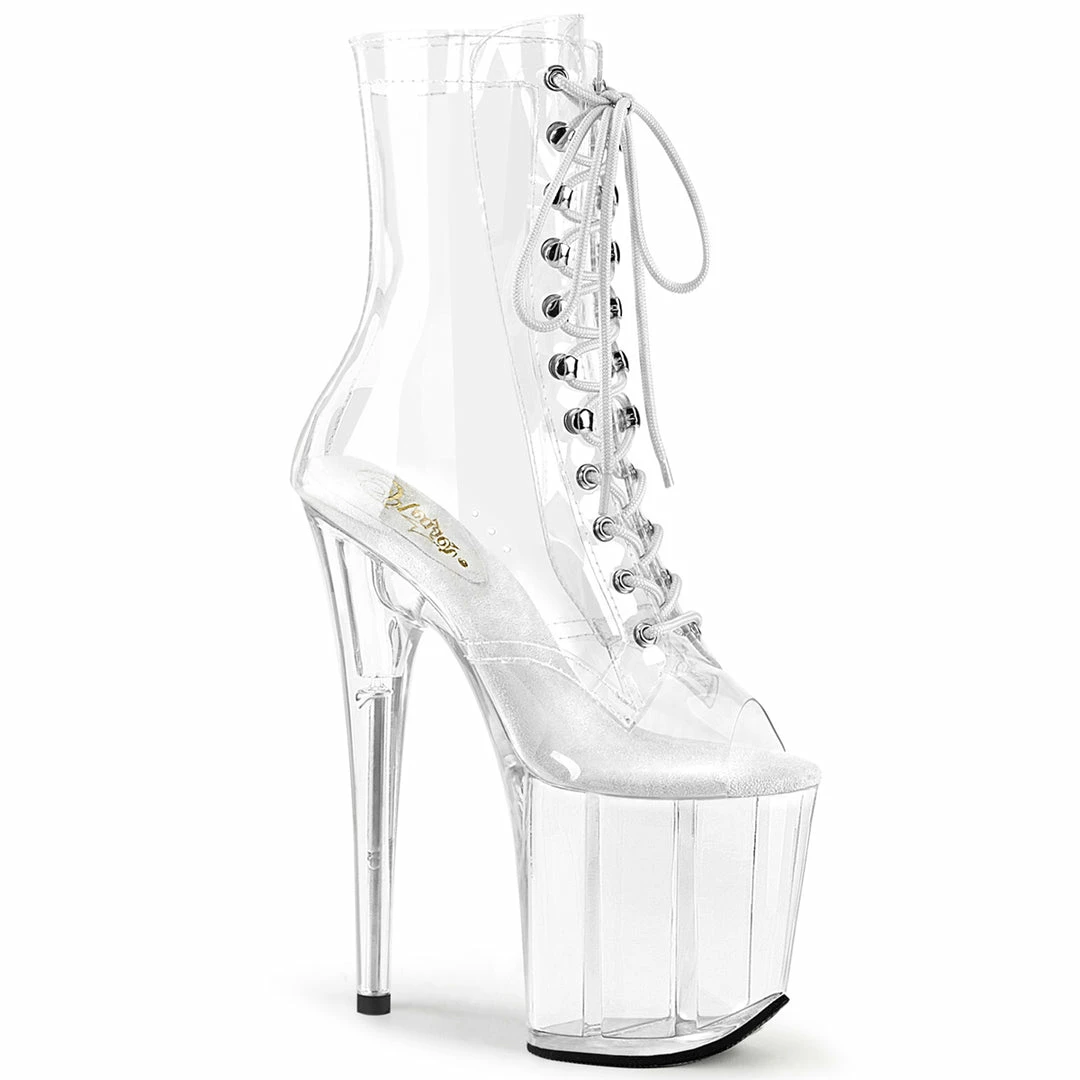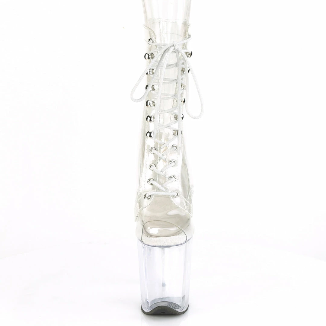 8″ (20.3cm) stiletto heel, 4″ (10.2cm) platform peep toe lace up front ankle boot.
