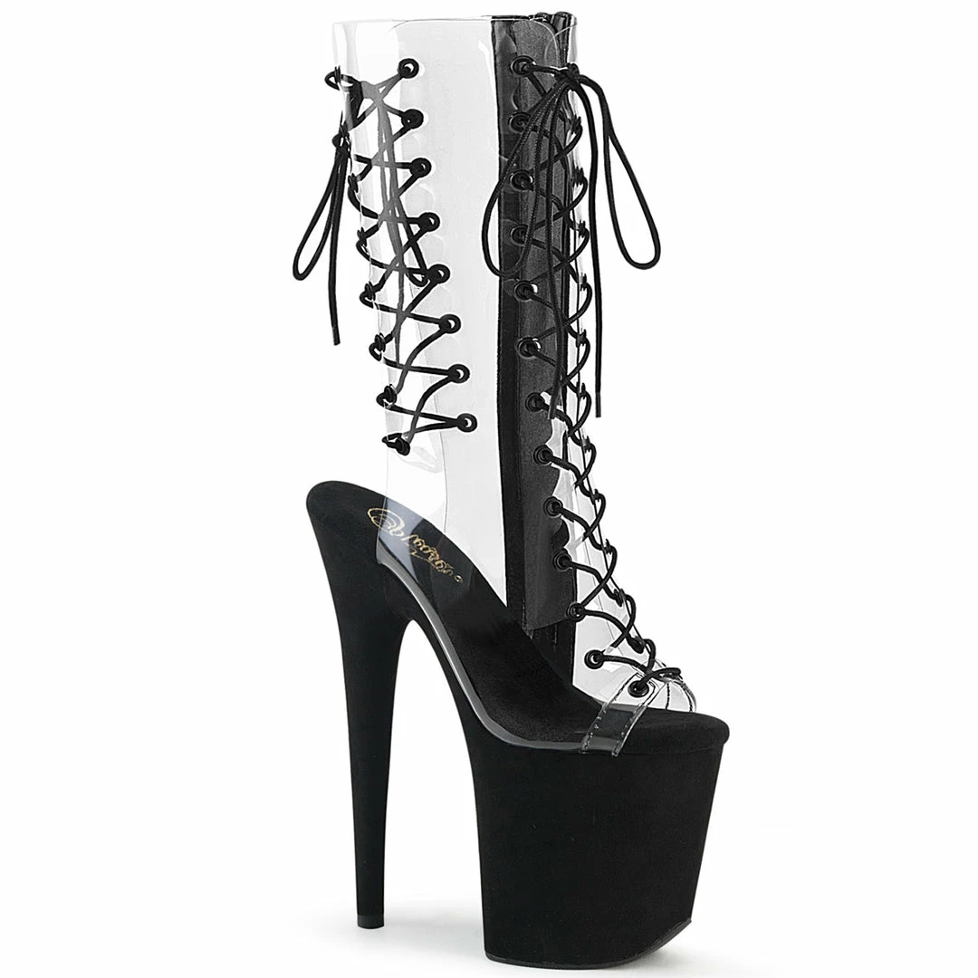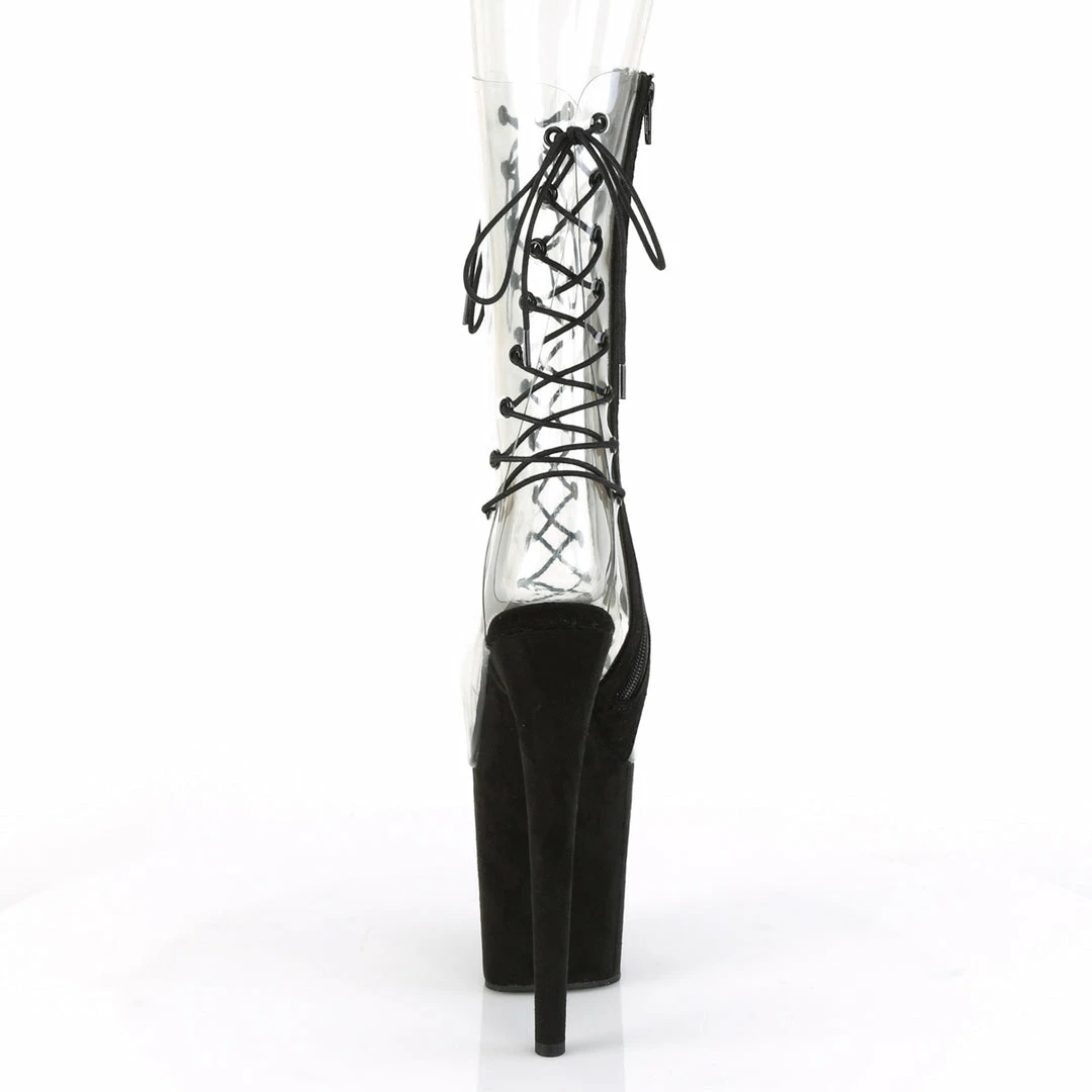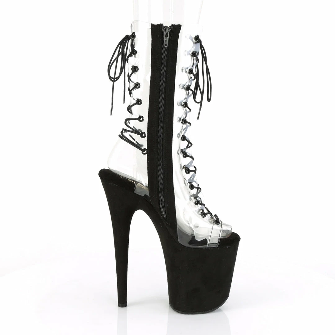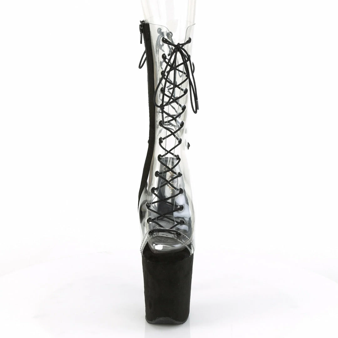 8″ (20cm) stiletto heel, 4″ (10cm) platform lace up front/back open toe/heel mid calf boot featuring fully wrapped platform bottom and inside zip closure.