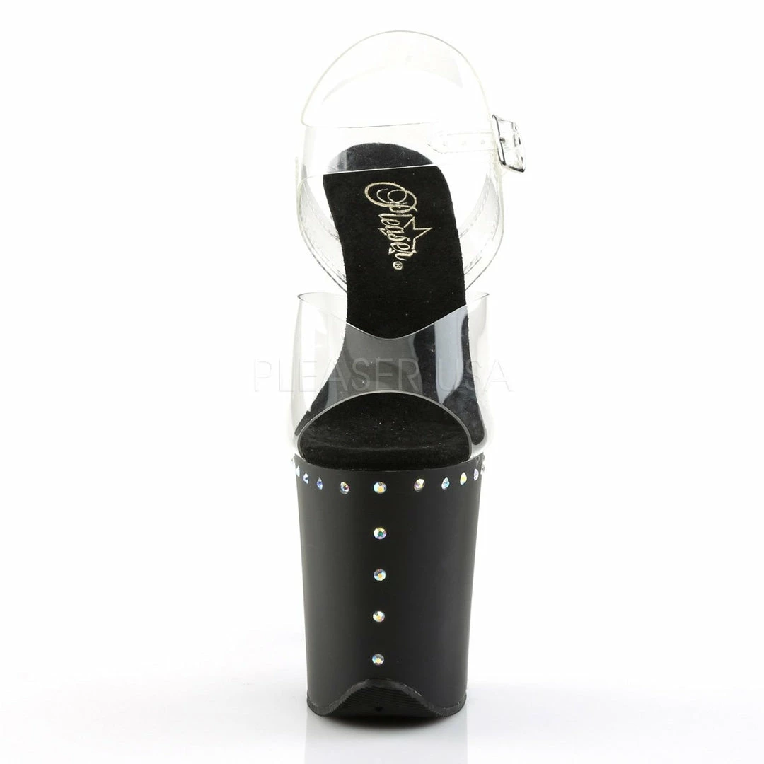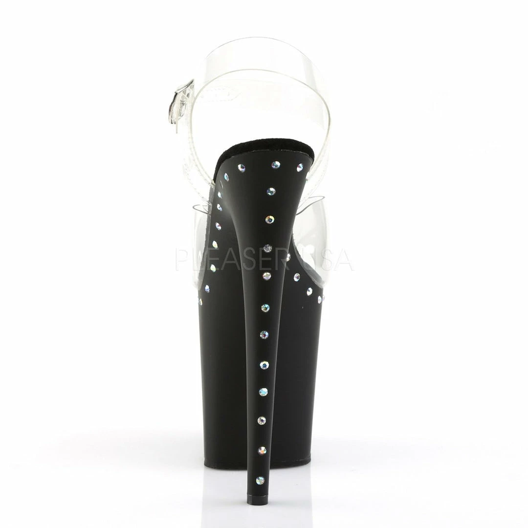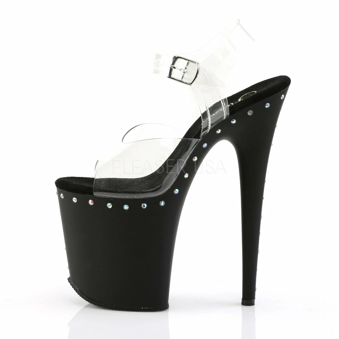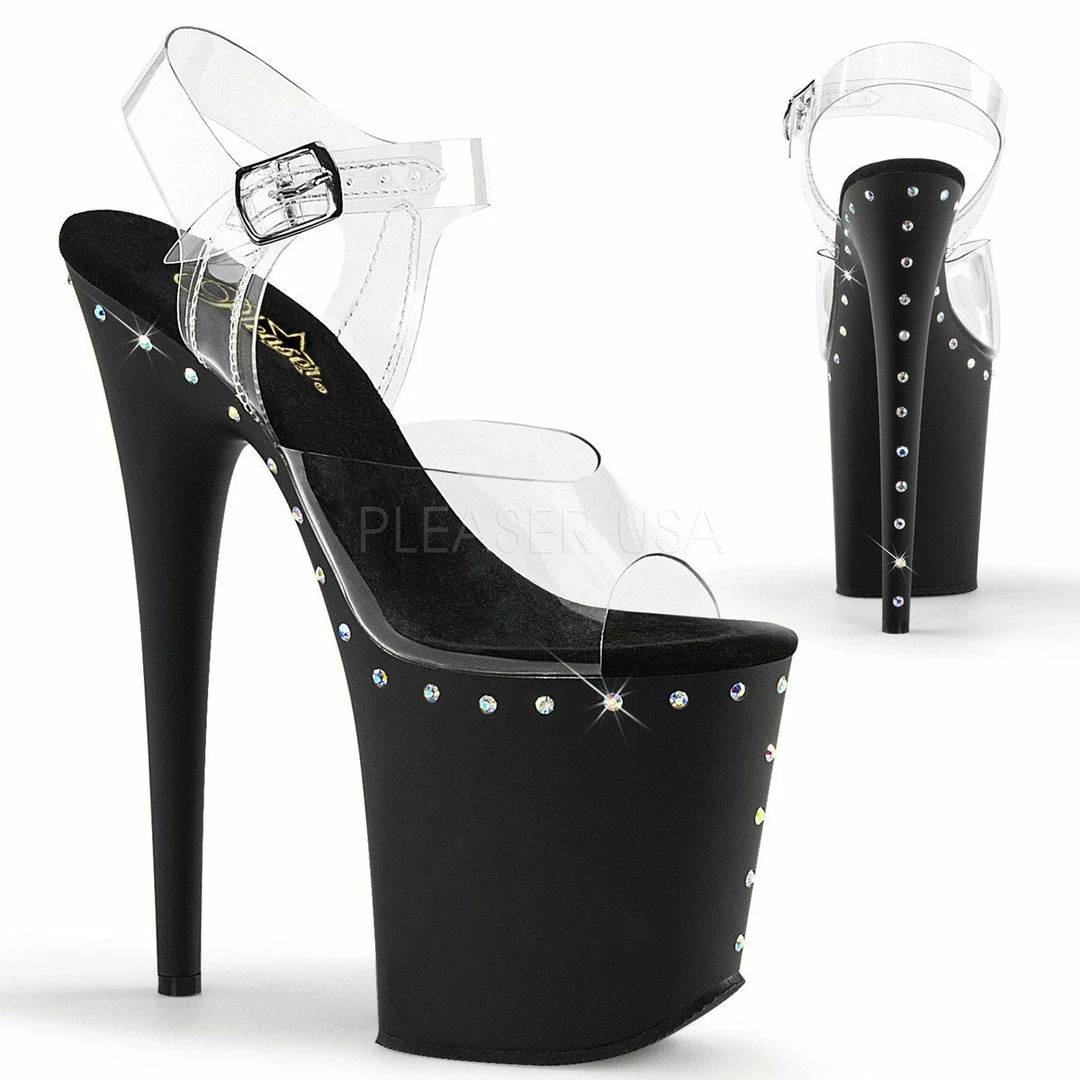 8″ (20.3cm) stiletto heel, 4″ (10.2cm) platform ankle strap sandals featuring AB lined rhinestones on the platform bottom.