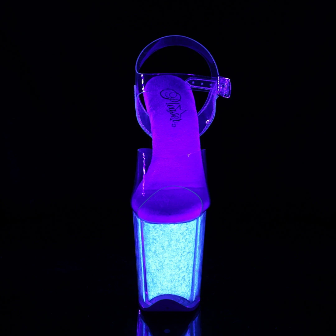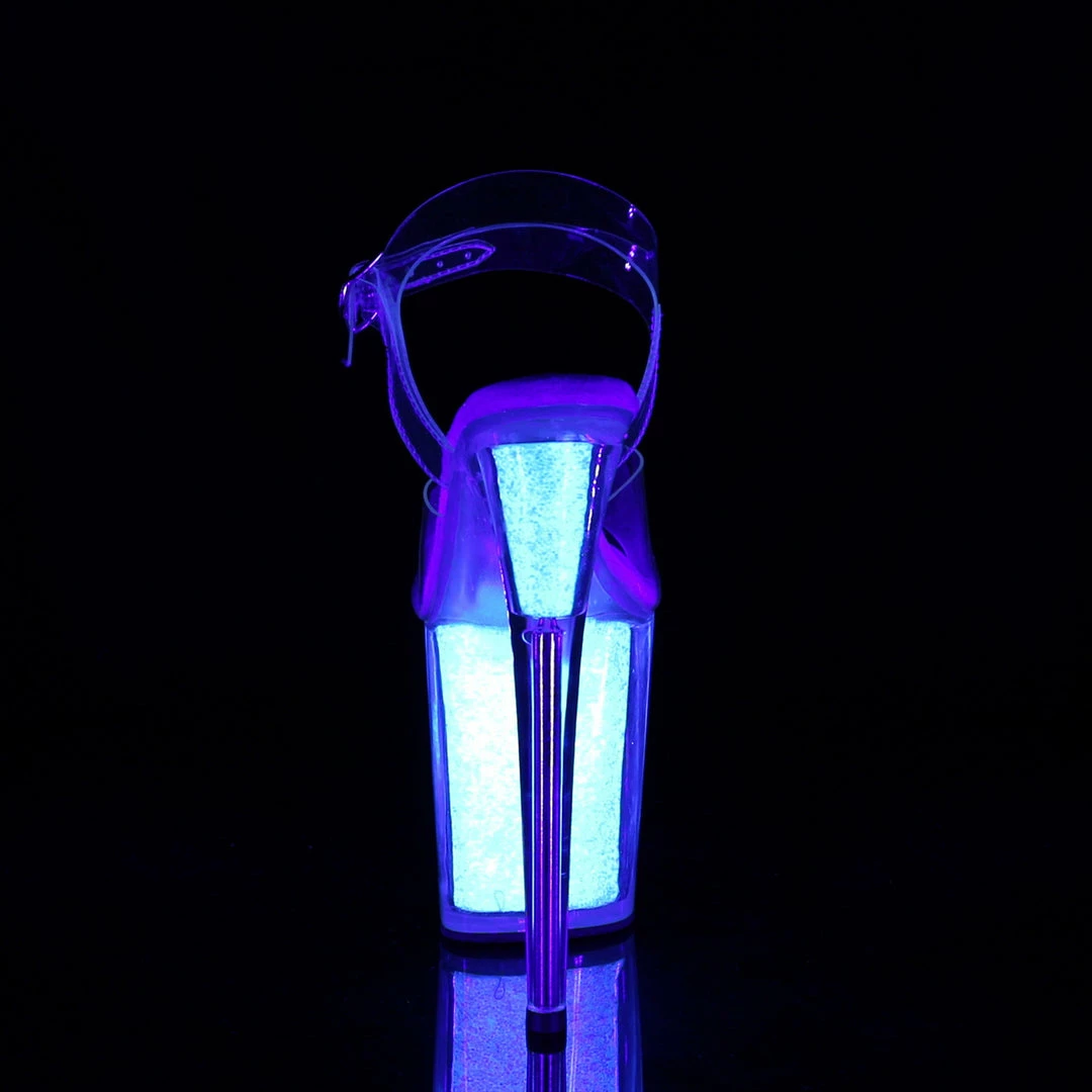 8″ (20.3cm) stiletto heel, 4″ (10.2cm)Β platformΒ ankle strap sandal featuring UV blacklight reactiveΒ glittered platform/glittered inserts.