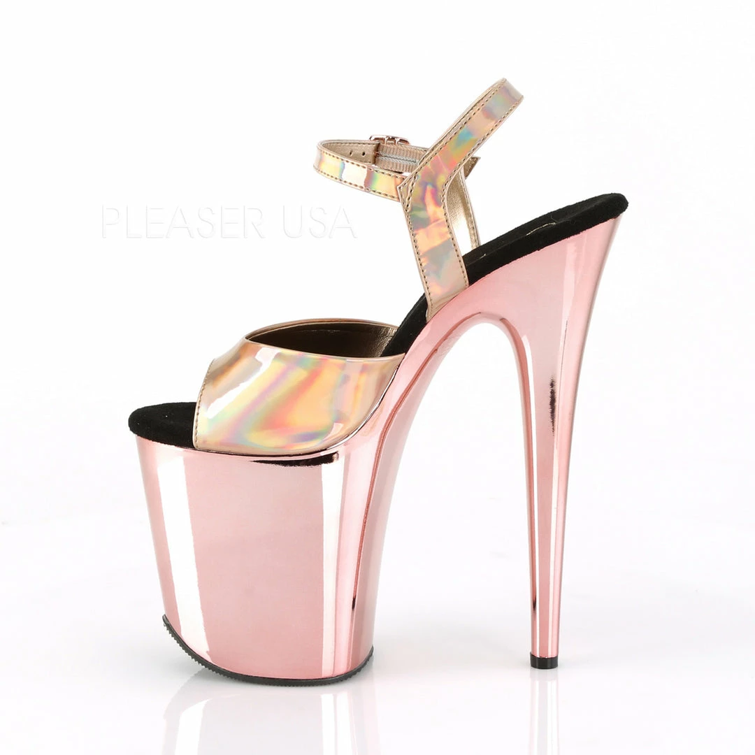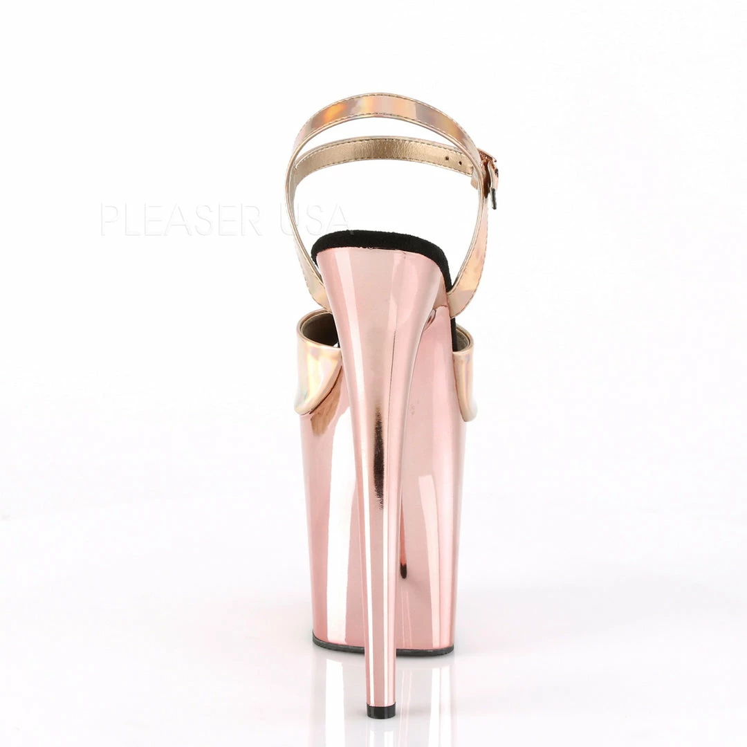 8″ (20.3cm) stiletto heel, 4″ (10.2cm) platform ankle strap sandal with chrome plated platform.