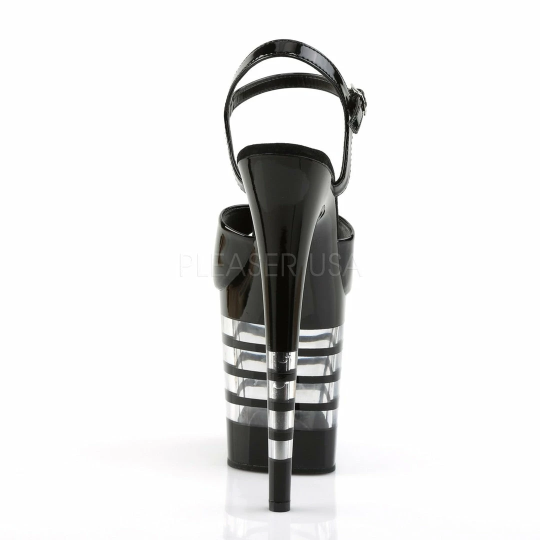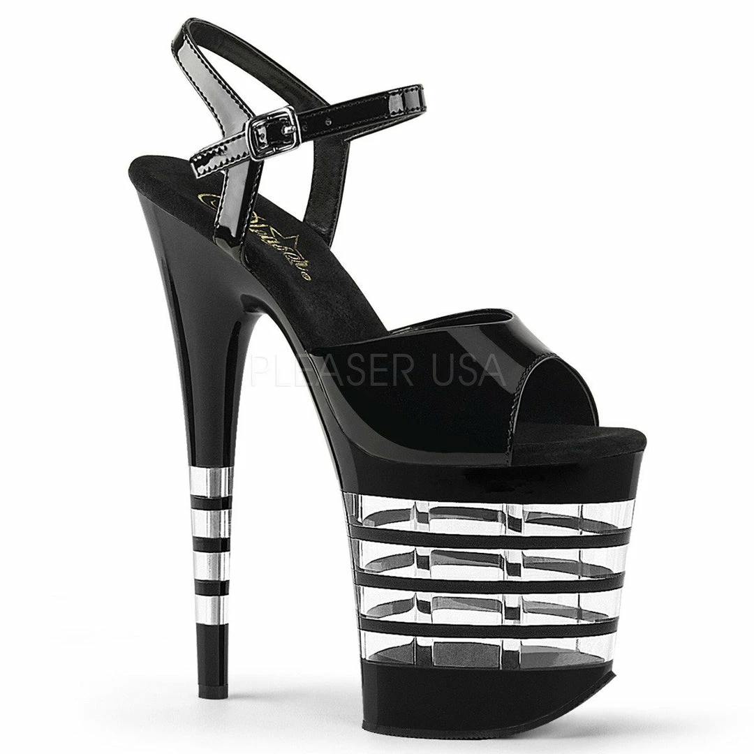 8″ (20.3cm) stiletto heel, 4″ (10.2cm) lined platform ankle strap sandal.