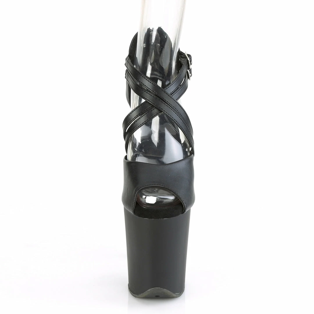 8″ (20cm) stiletto heel, 4″ (10cm) platform peep toe close back sandal featuring dual criss cross strap buckle straps.