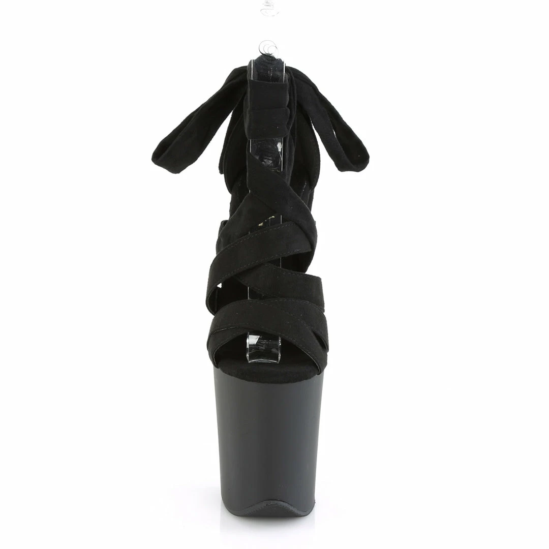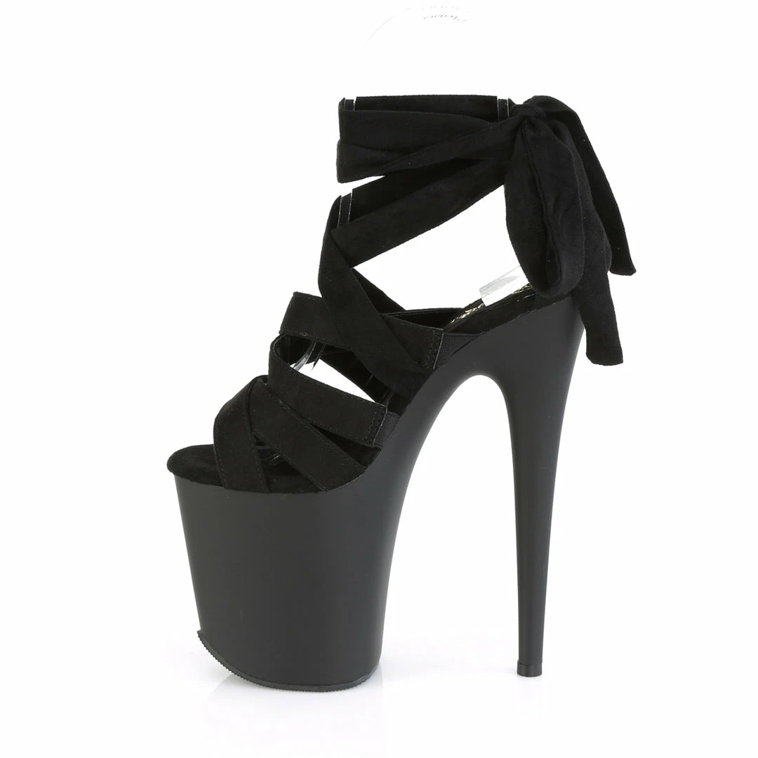 8″ (20cm) stiletto heel, 4″ (10cm) platform criss-cross ankle wrap sandal.