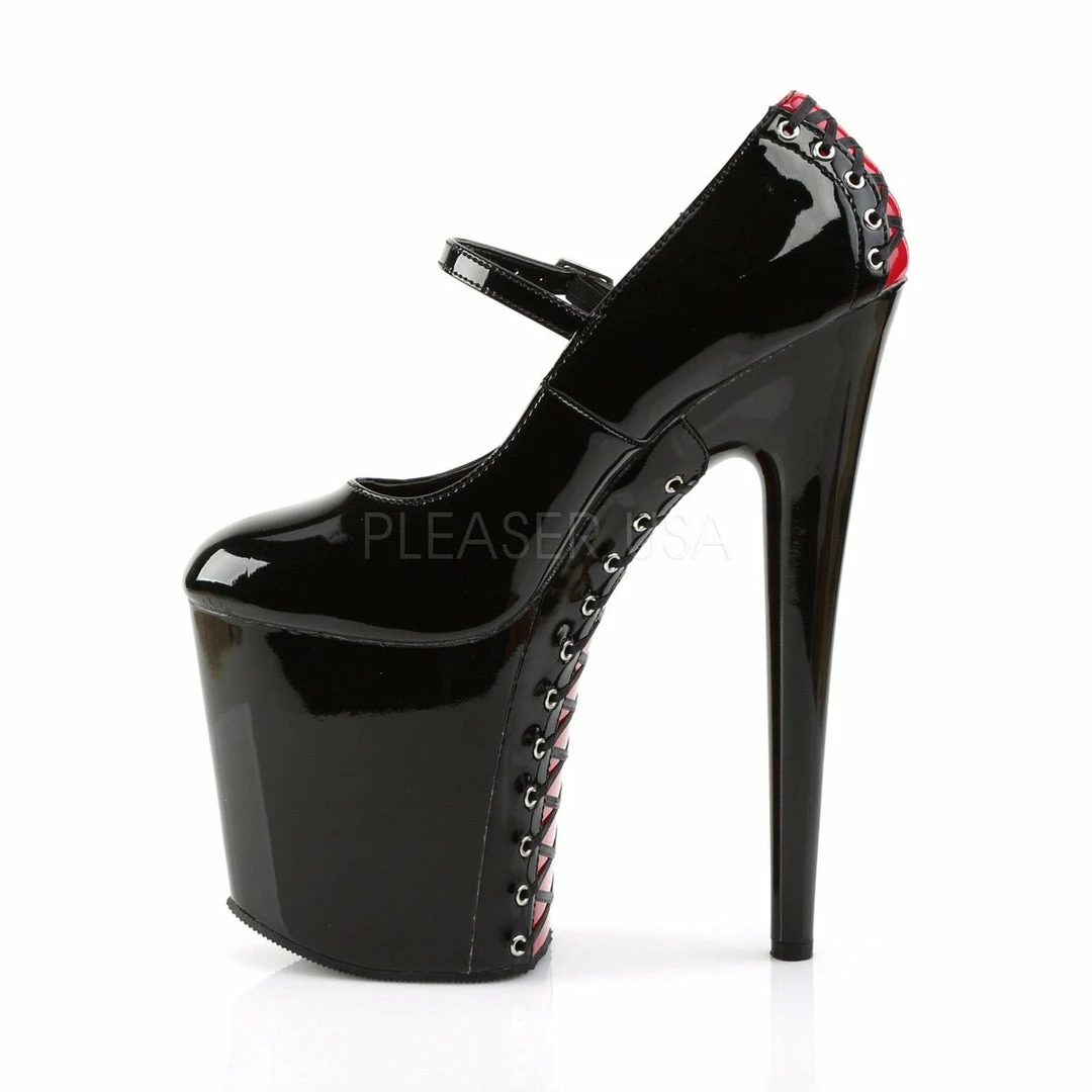 8″ (20.3cm) stiletto heel, 4″ (10.2cm) platform Mary Jane pump featuring back of platform and heel lace pattern.