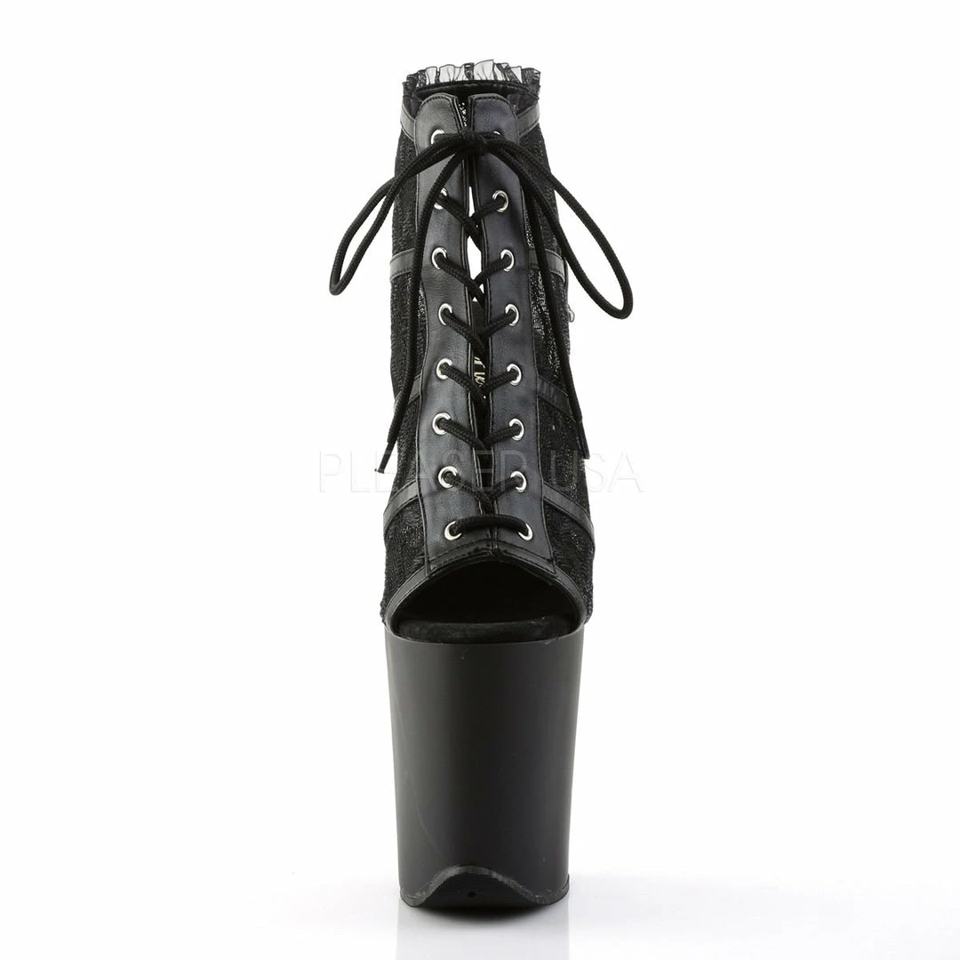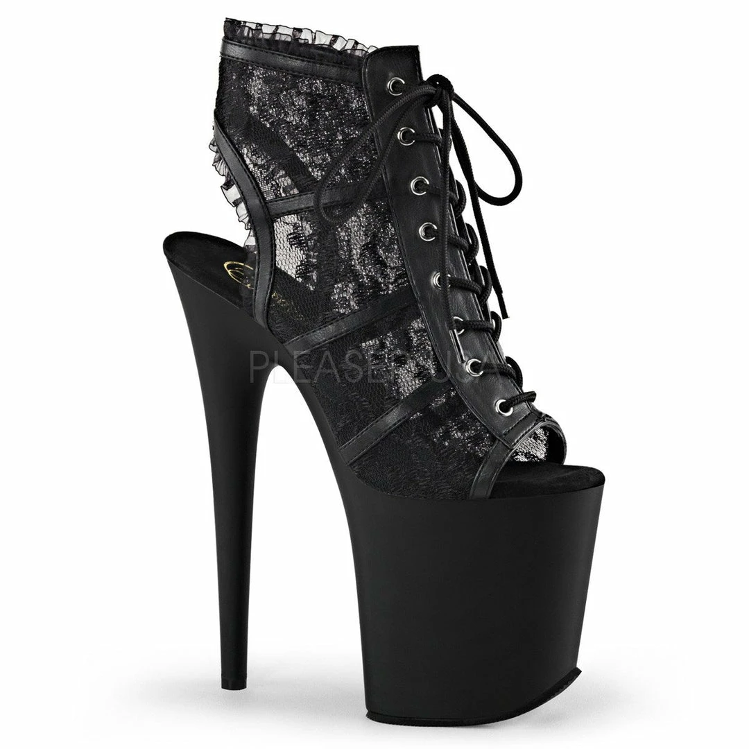 8″ (20.3cm) stiletto heel, 4″ (10.2cm) platform open toe/heel lace-up front ankle boot with lace trim detail, inside zip closure.