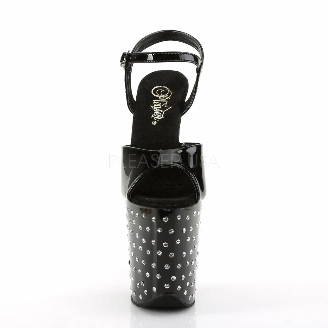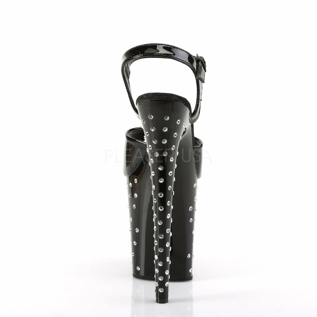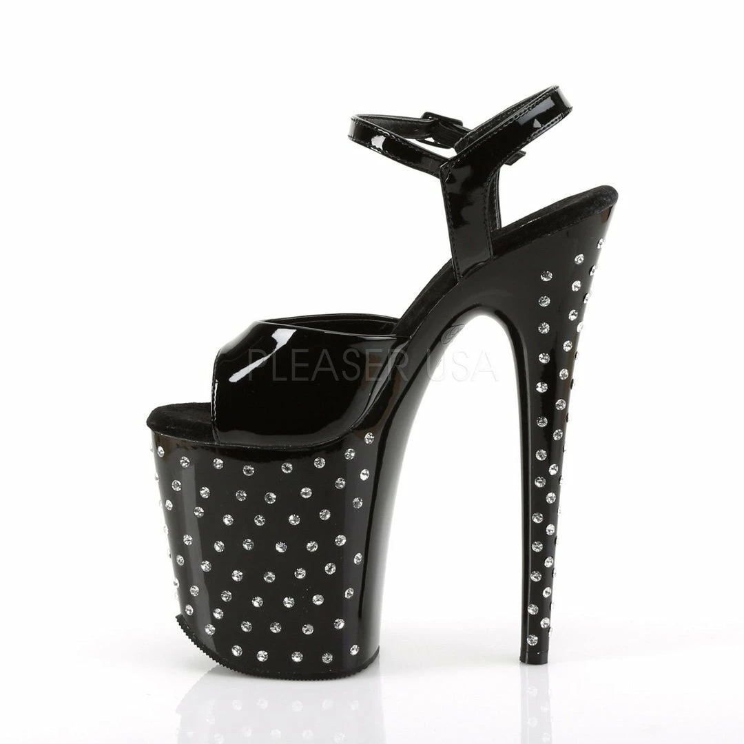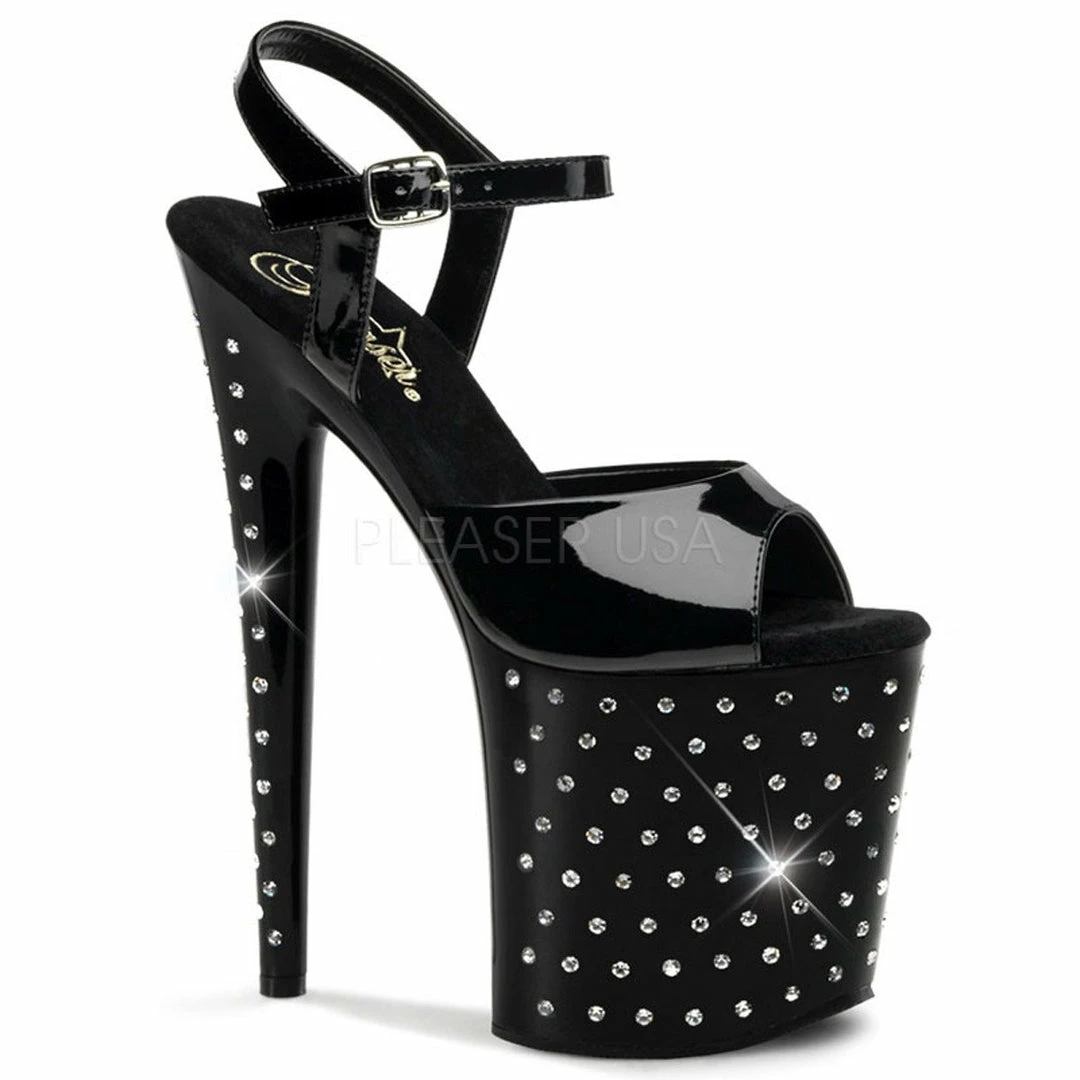 8″ (20.3cm) heel, 4″ (10.2cm) platform ankle strap sandal featuring rhinestone studded platform bottom.