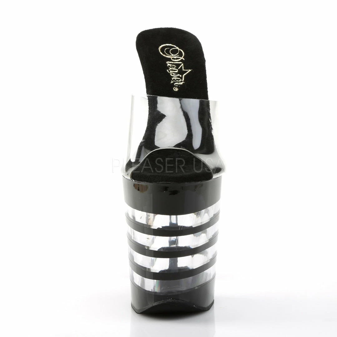 8″ (20.4cm) Heel, 4″ (10.2cm) platform peep toe slide.
