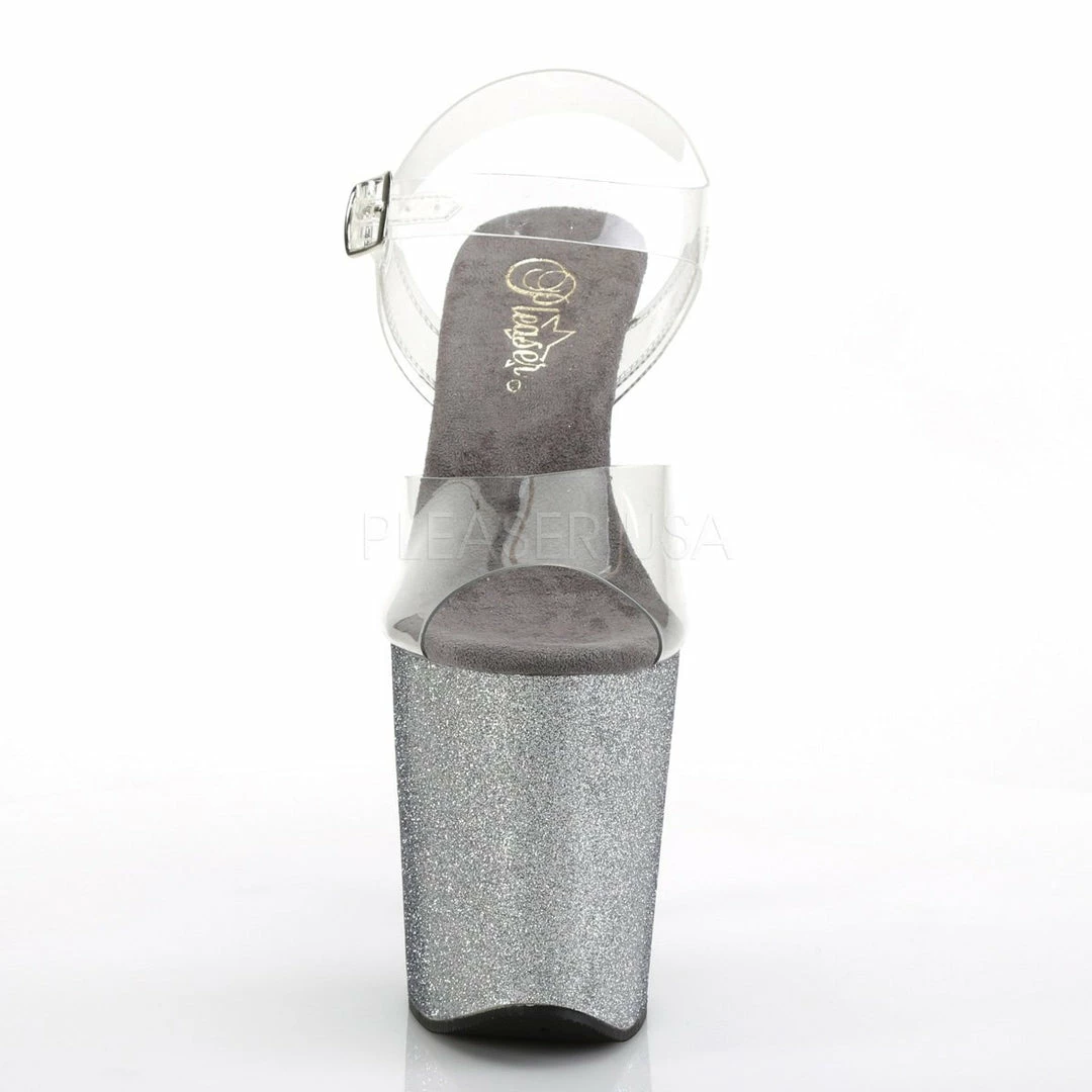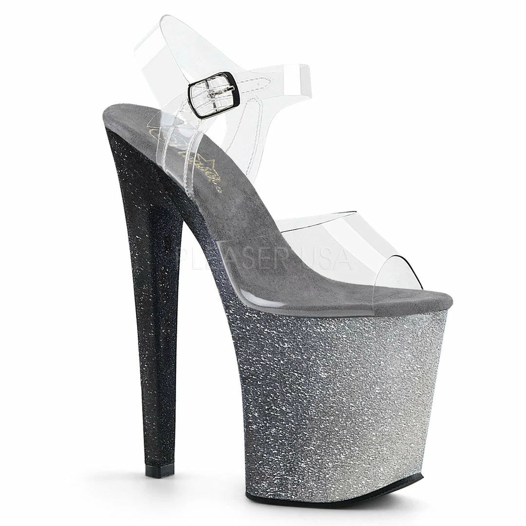 8″ (20.4cm) Heel, 4″ (10.2cm) platform ankle strap sandal featuring the entire platform bottom covered with multi colored glitters for an ombre effect.