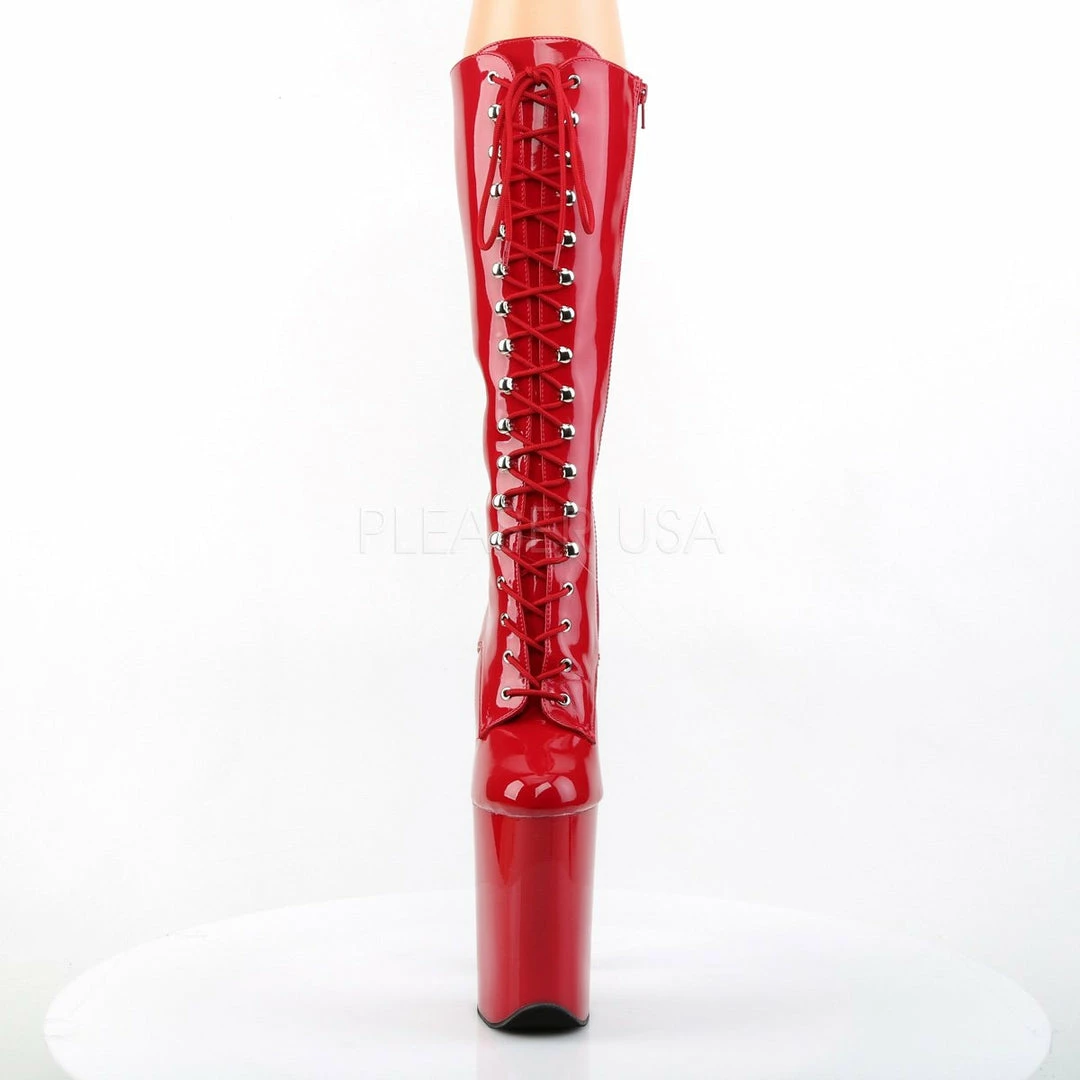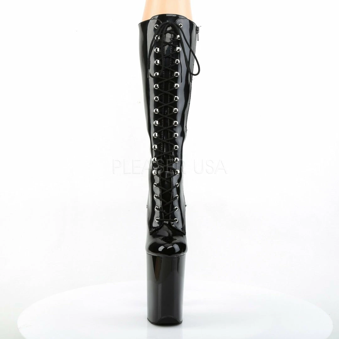 9″ (22cm) heel, 5 1/4 ” (13.3cm) platform front lace-up knee boot with full inner side zipper.