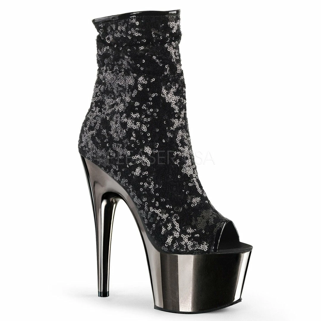 7″ (17.8cm) stiletto heel, 2 3/4″ (7cm) chrome plated platform sequined peep toe, ruched shaft ankle boot. Inside zip closure.
