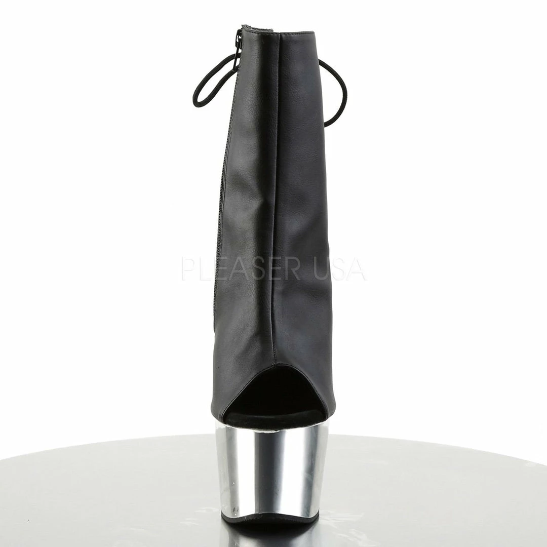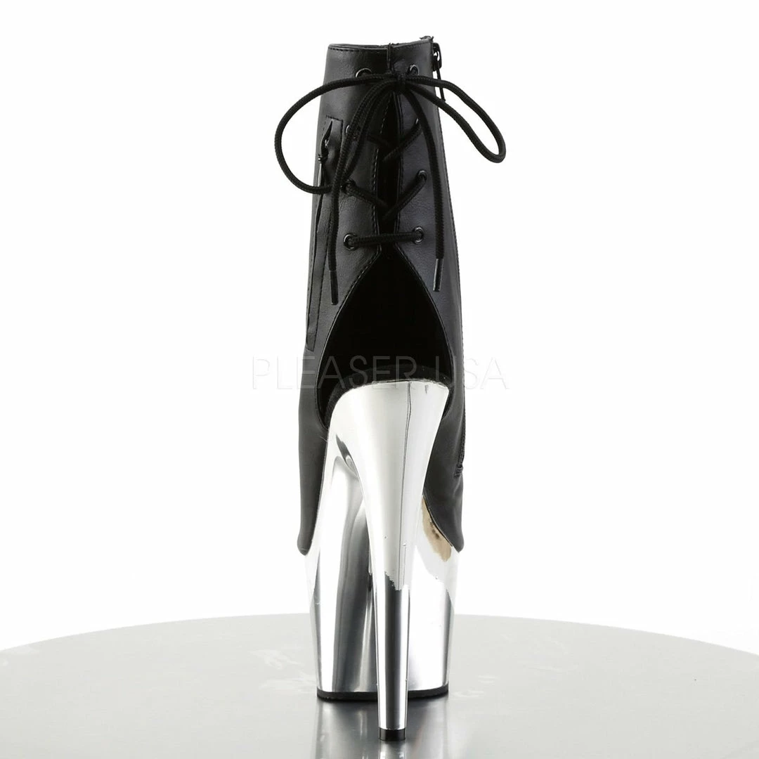 7″ (17.8cm) stiletto heel, 2 3/4″ (7cm) platform open toe/heel, back lace up ankle boot with hidden zip pocket and inside zip closure.
