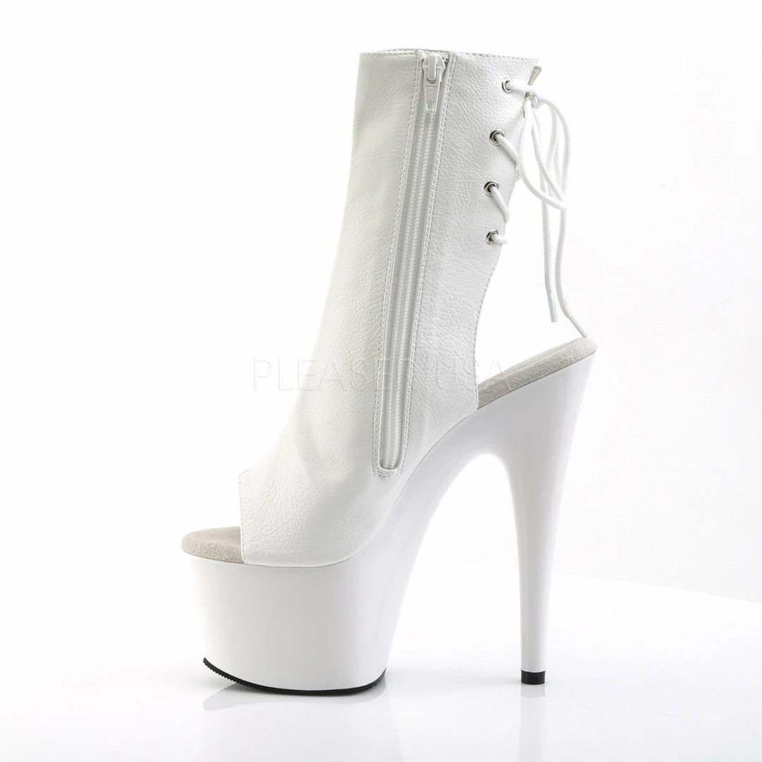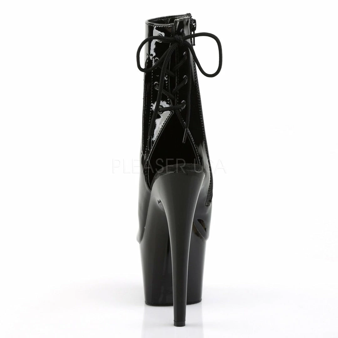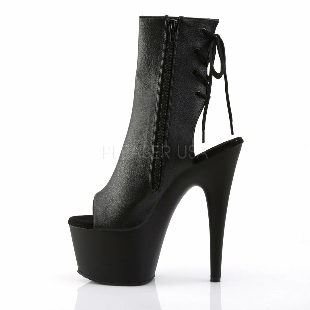 7″ (17.8cm) stiletto heel, 2 3/4″ (7cm)Β platform open toe/heel, back lace up ankle boot with hidden zip pocket and full inside zip closure.