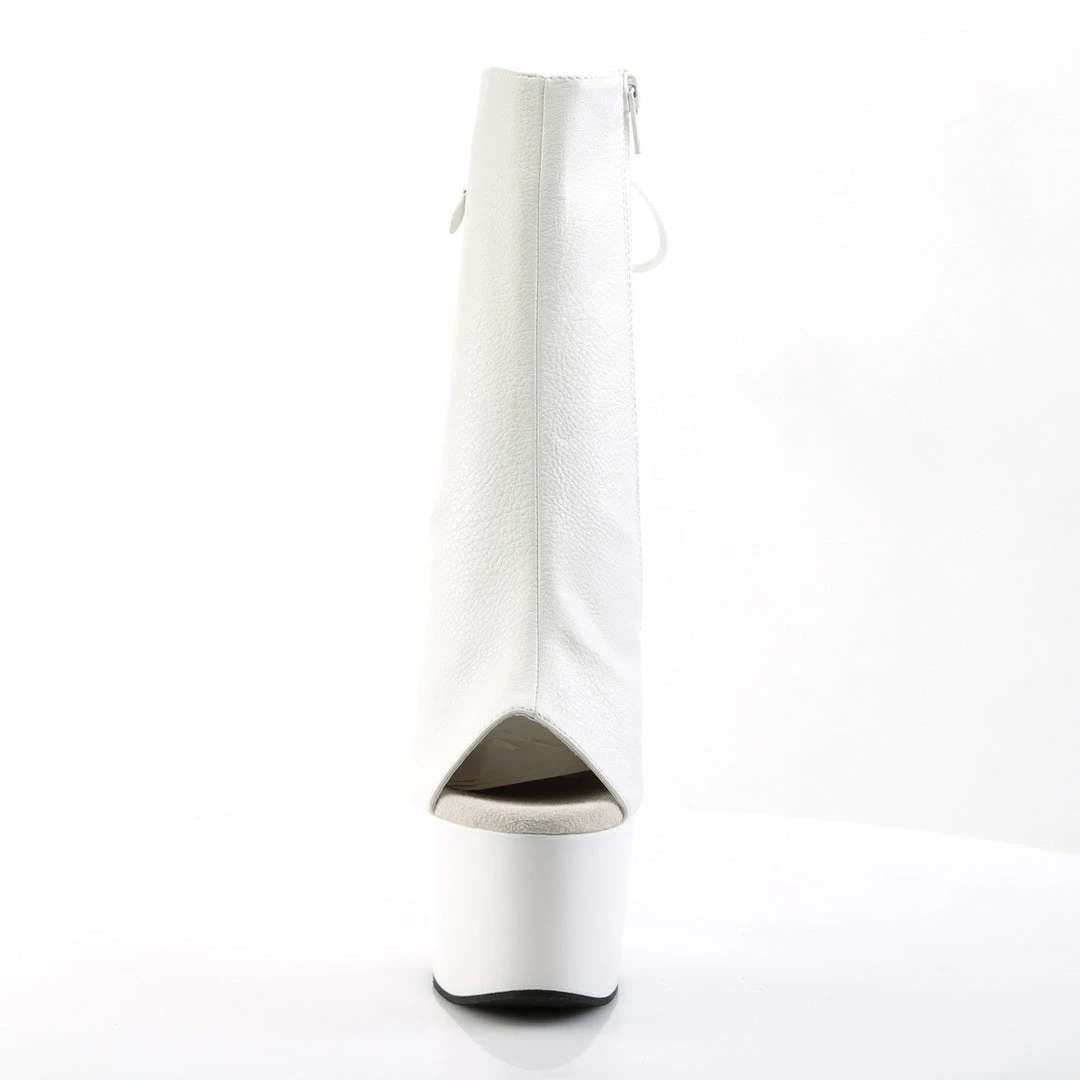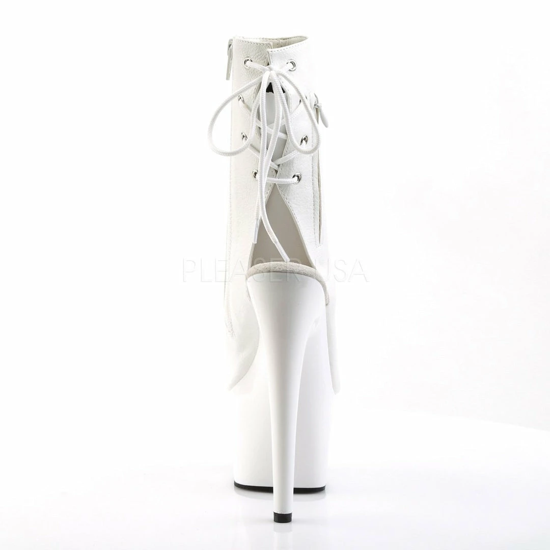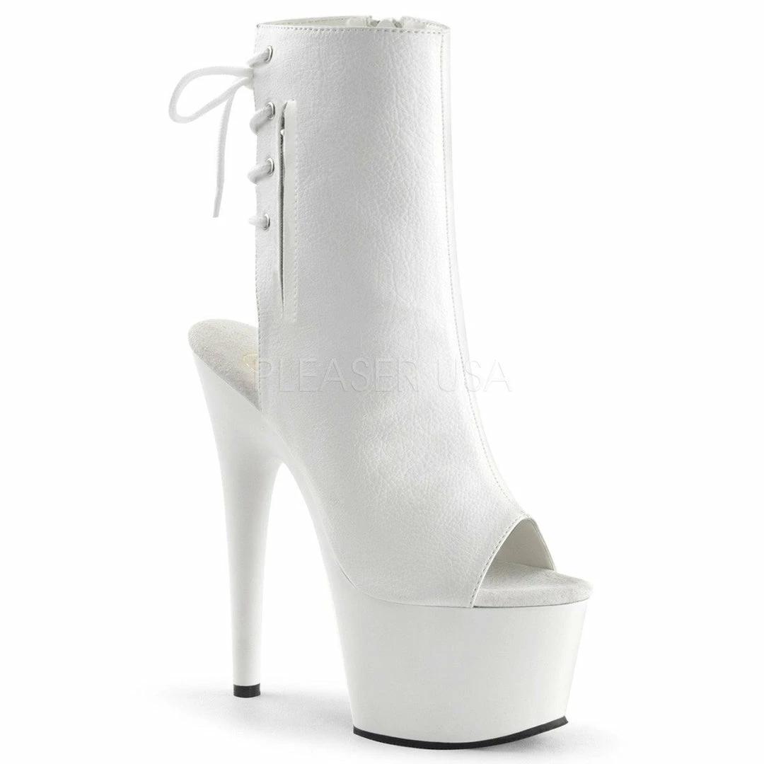 7″ (17.8cm) stiletto heel, 2 3/4″ (7cm)Β platform open toe/heel, back lace up ankle boot with hidden zip pocket and full inside zip closure.