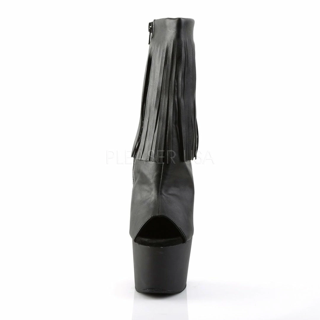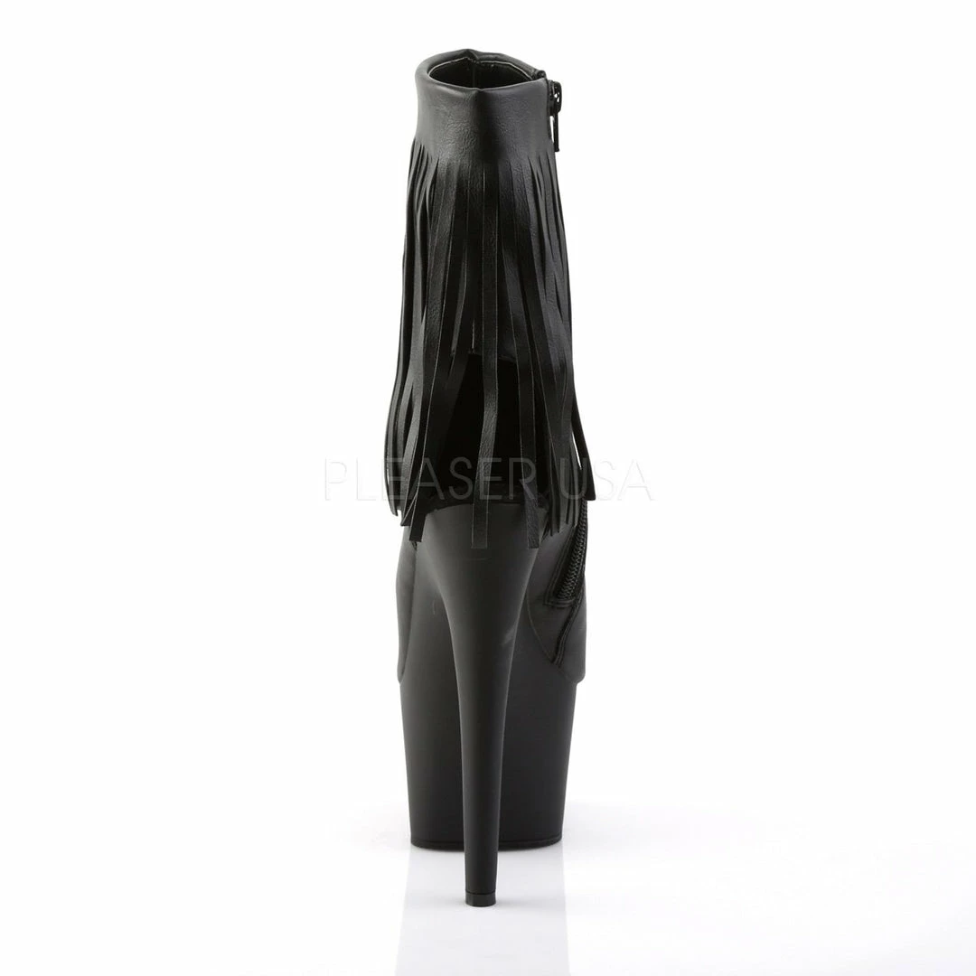 7″ (17.8cm) stiletto heel, 2 3/4″ (7cm)Β platformΒ open toe/heel fringe ankle boot with inside zip closure.