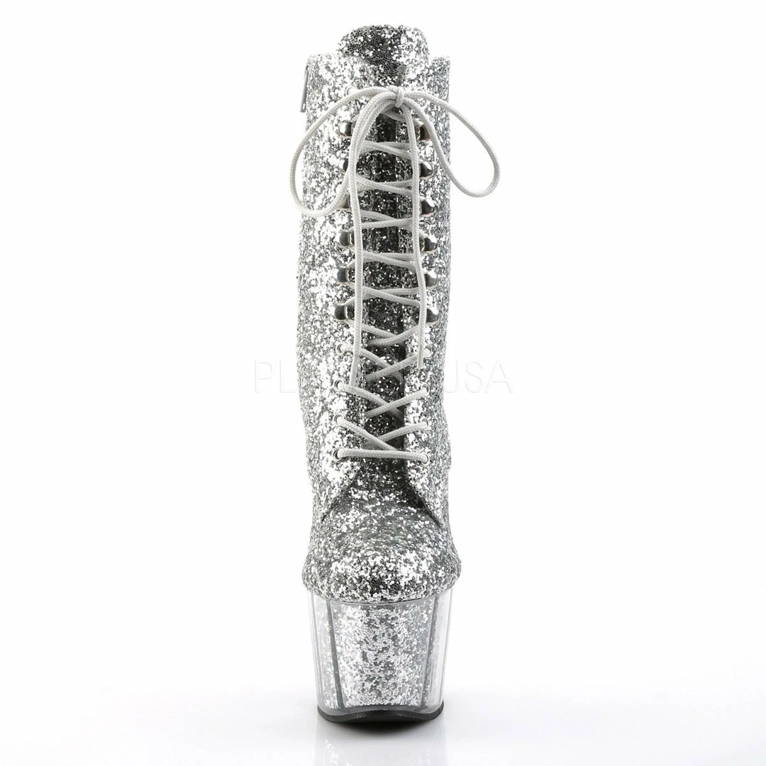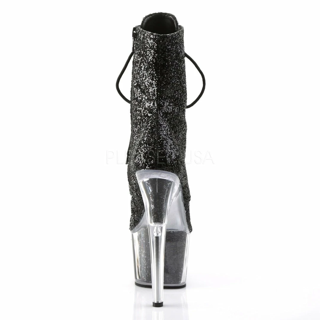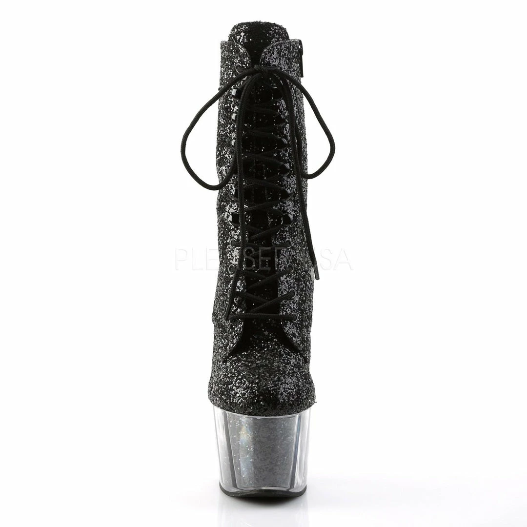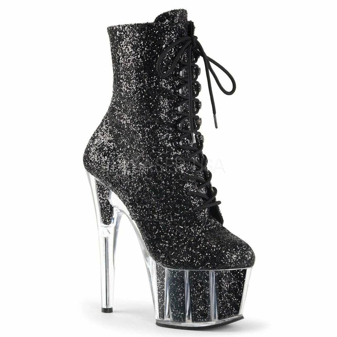 7″ (17.8cm) stiletto heel, 2 3/4″ (7cm)Β Glitter filled platform front lace-up ankle boot, inside zip closure.