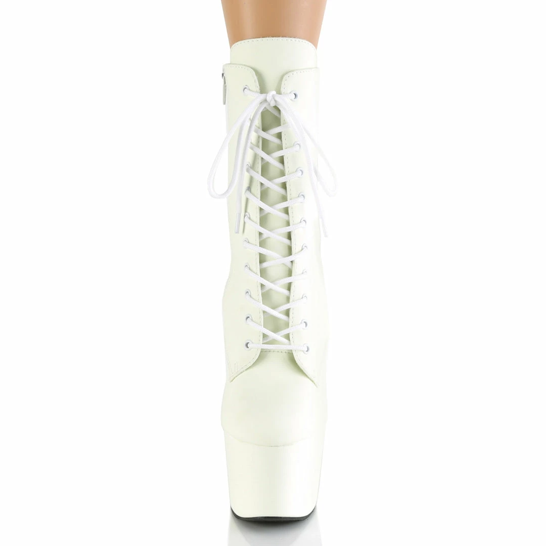 7″ (17.8cm) heel, 2 3/4″ (7cm) Platform lace-up ankle boot featuring glow in the dark upper and platform bottom.