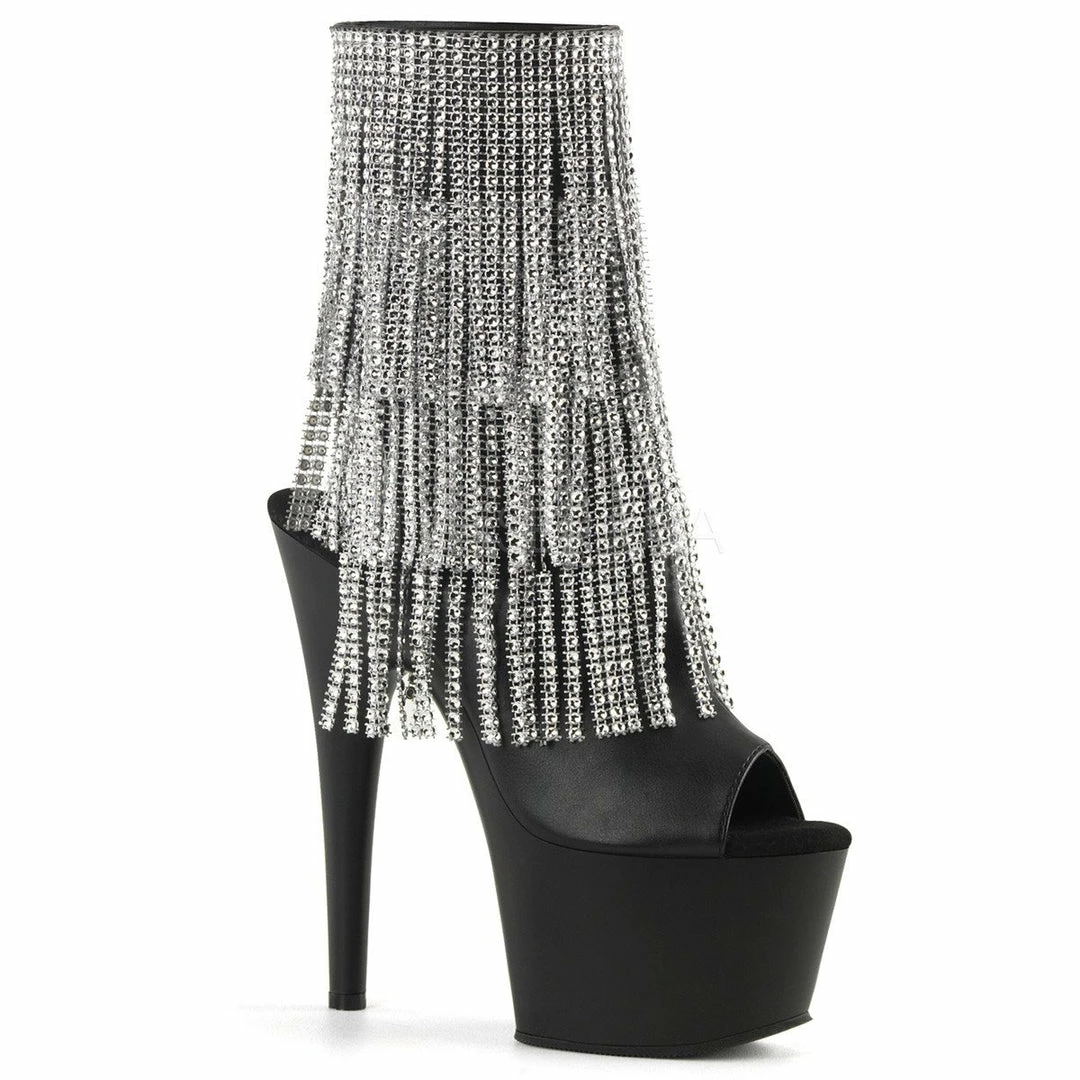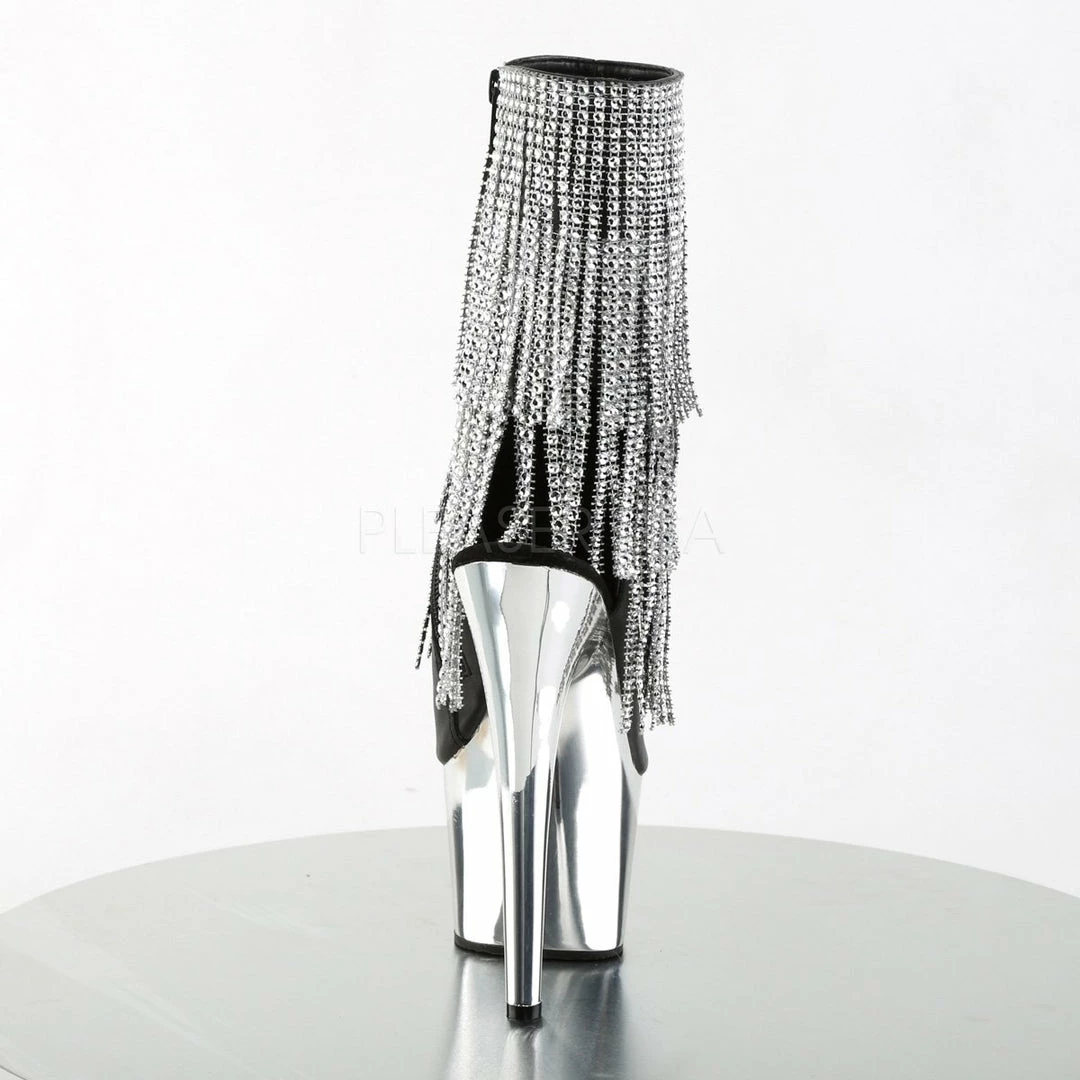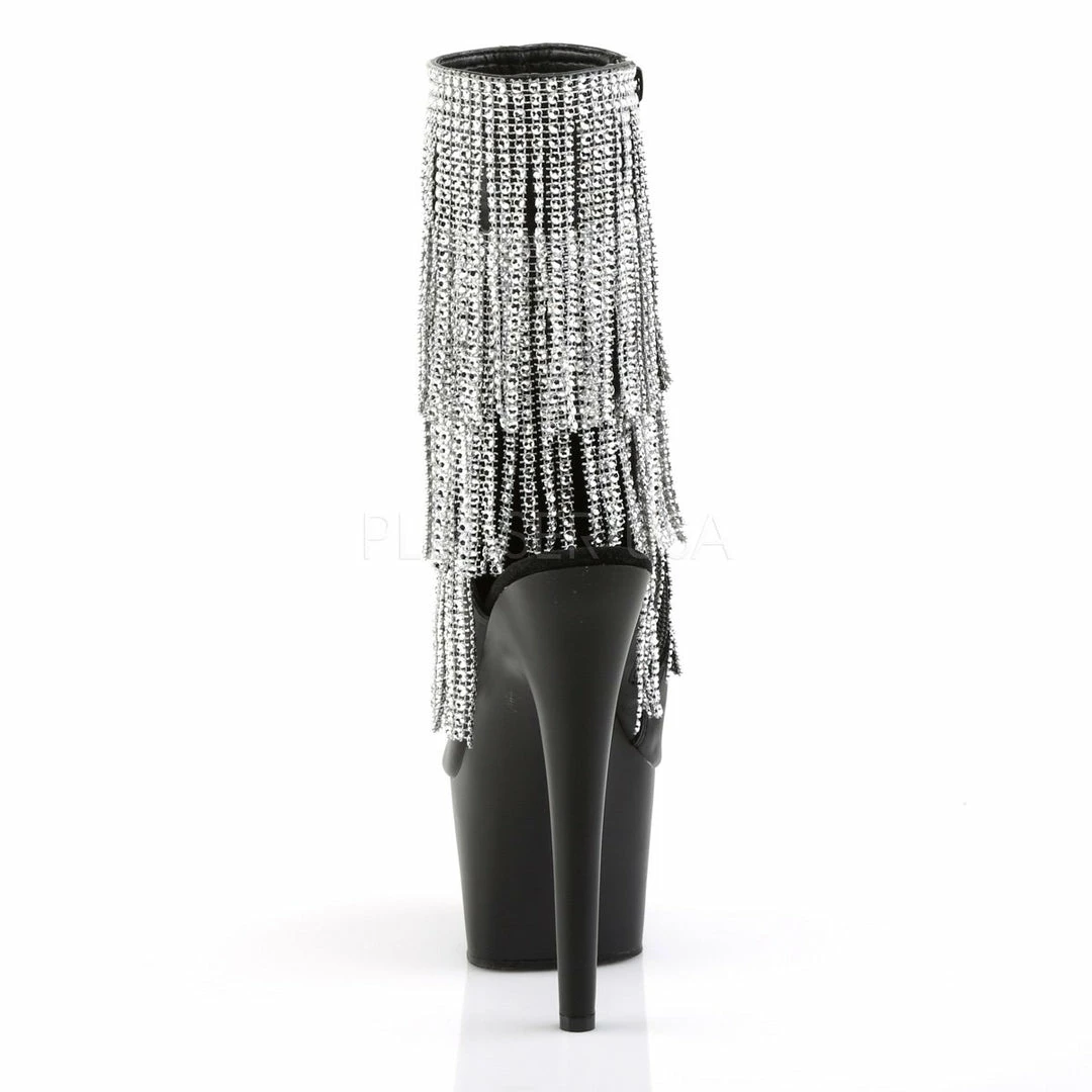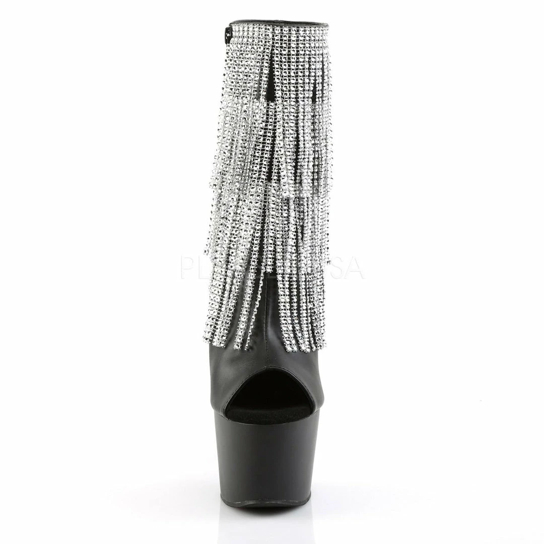7″ (17.8cm) stiletto heel, 2 3/4″ (7cm)Β platformΒ open toe/heel ankle boot featuring 3 layer chrome plated, simulated rhinestone fringe with inside zip closure.