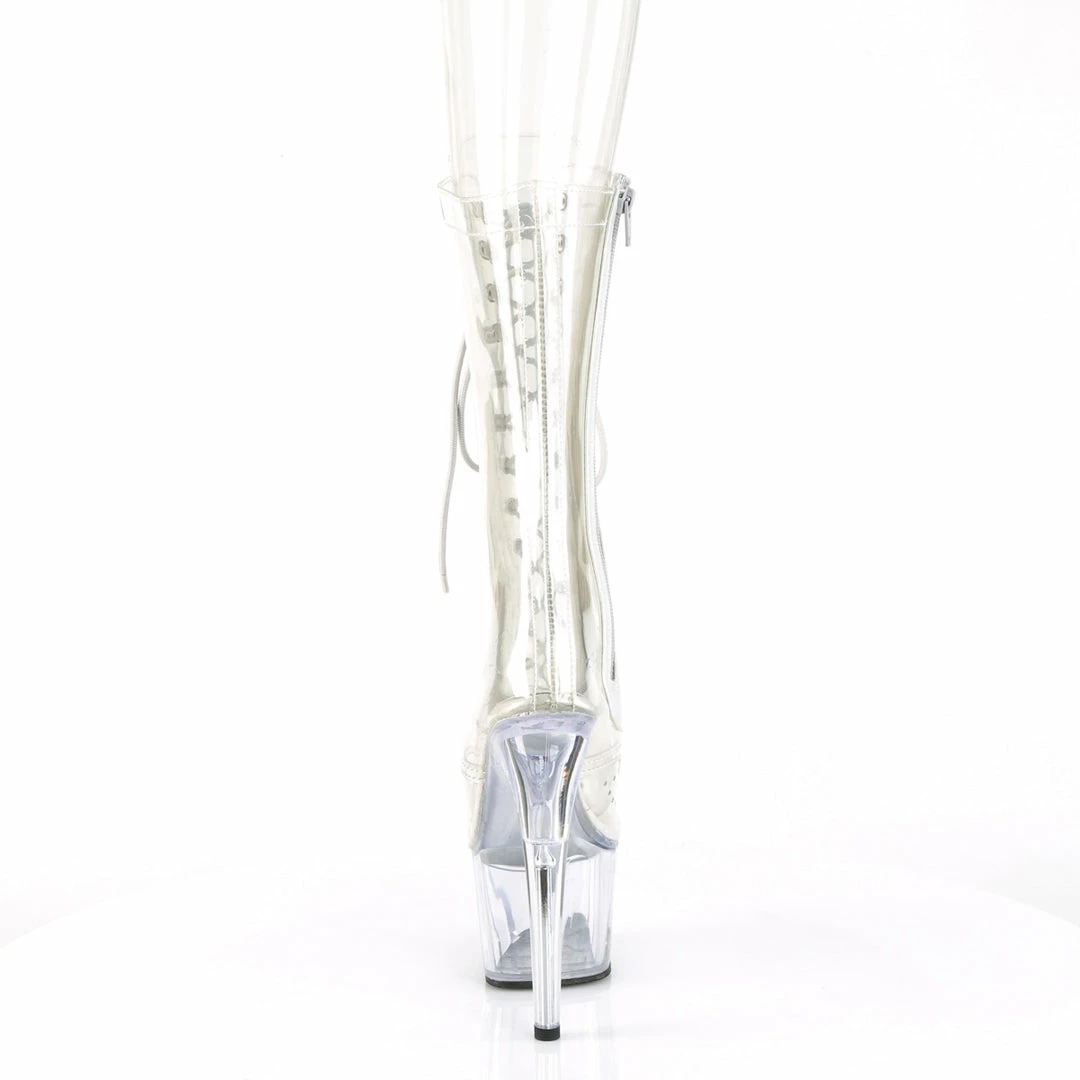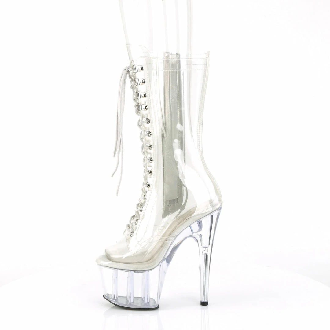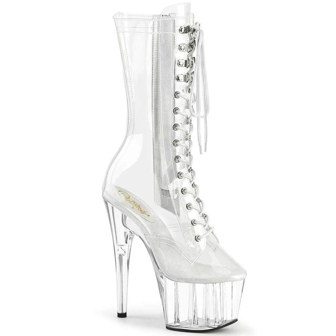 7″ (17.8cm) stiletto heel, 2 3/4″ (7cm) platform lace-up front mid calf boot with inner side zip closure.