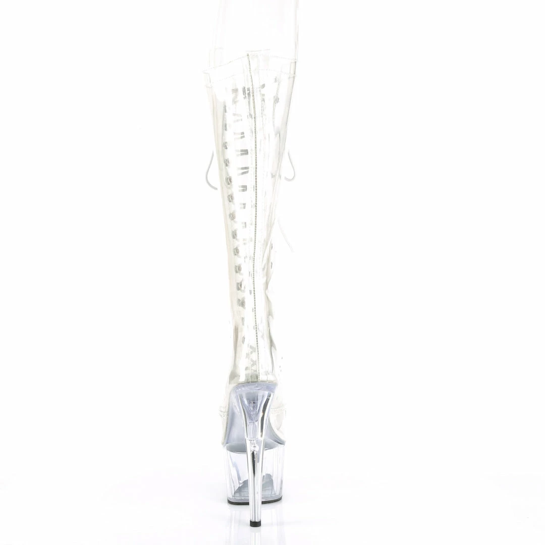 7″ (17.8cm) heel, 2 3/4″ (7cm) platform peep toe lace-up front knee boot.