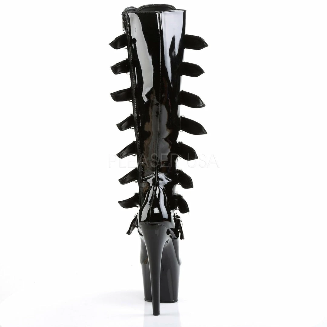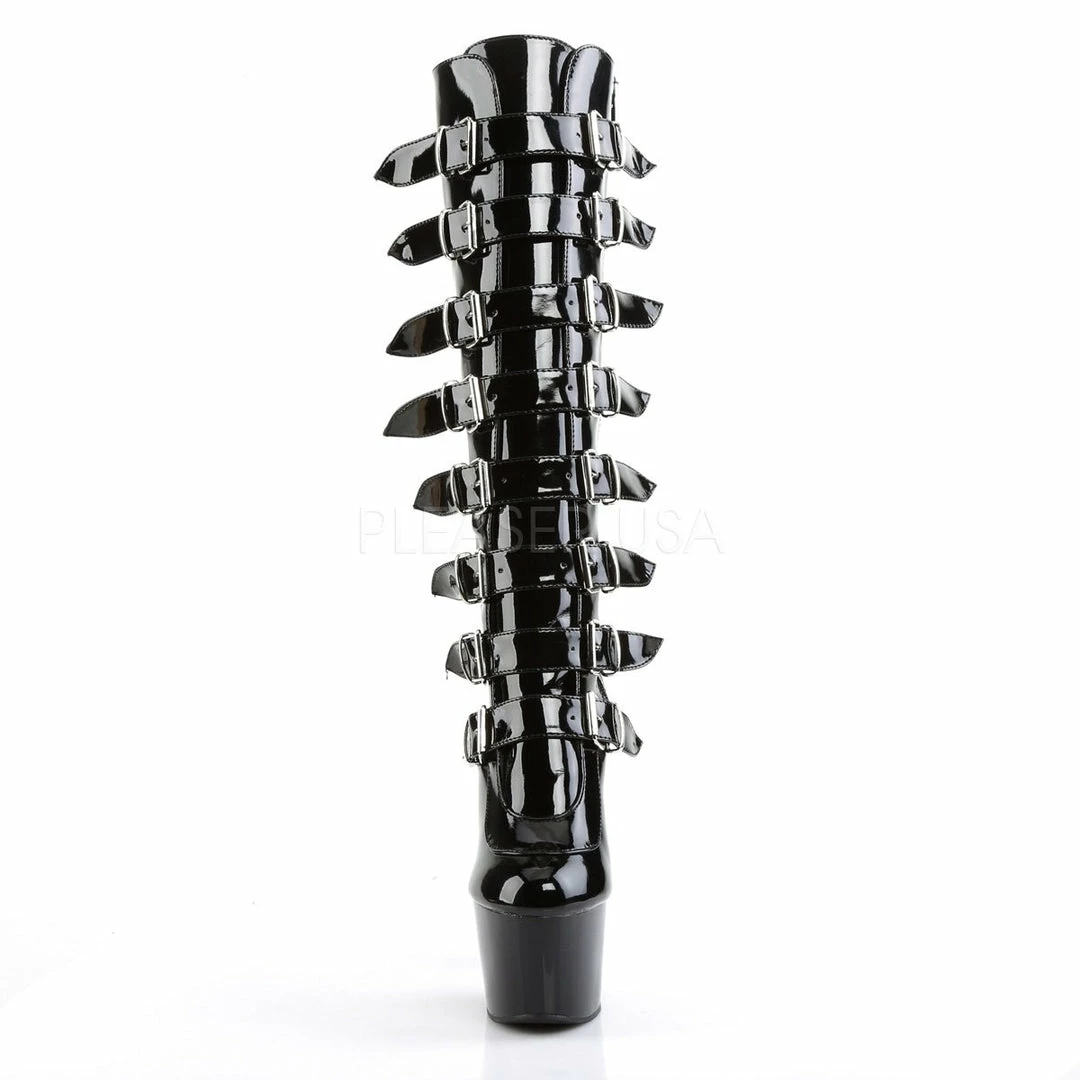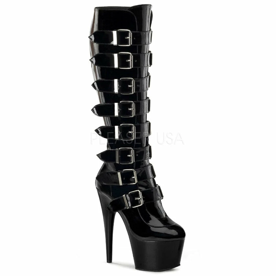 7″ (17.8cm) Stiletto Heel, 2 3/4″ (7cm) platformΒ knee boot with buckles, full inner side zipper.