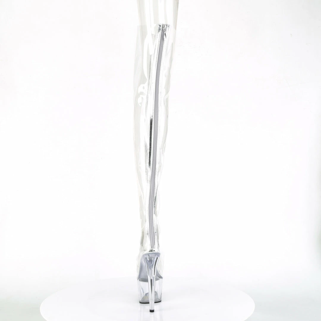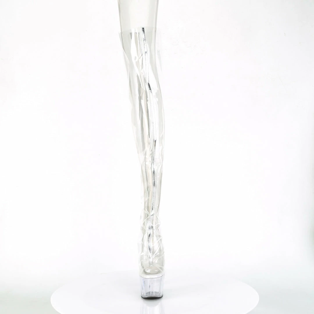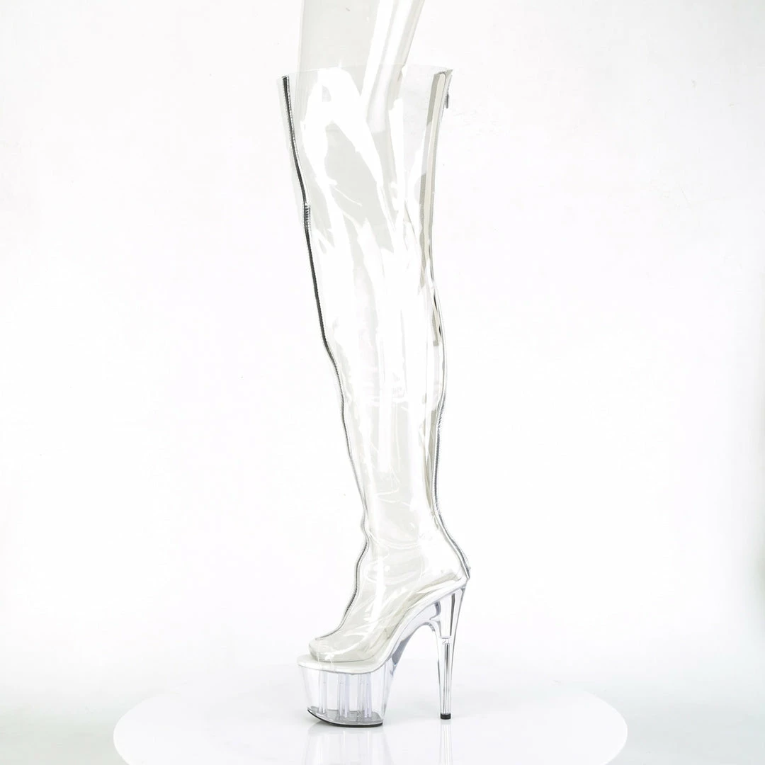 7″ (17.8cm) heel, 2 3/4″ (7cm) platform open toe thigh high boot with back zip closure.