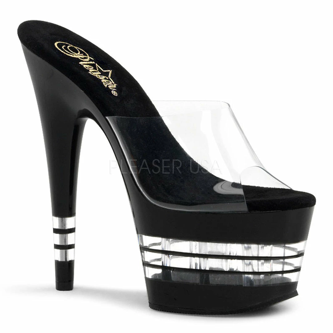 7″ (17.8cm) Stiletto heel, platform slide featuring clear, lined bottom.